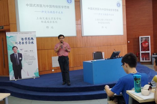 随后,邵远就中国西医如何应对传统哲学思想这一话题做了深入剖析,他说:“文化更多地追求的是过程,不是结果。”他简要介绍了包含有儒、道、释的中国古代哲学和医生与哲学的关系,同时详细分析了医学的中西方冲突——“西方的医学体系注重基本理论、医疗流程、操作规范、评判体系和技术培训,而中国人处世思维包含长生不老的传统观念、文化差异、运行体制和中医影响。”他鼓励同学们像厨师对待美食那样在医学上融中西医之所长。