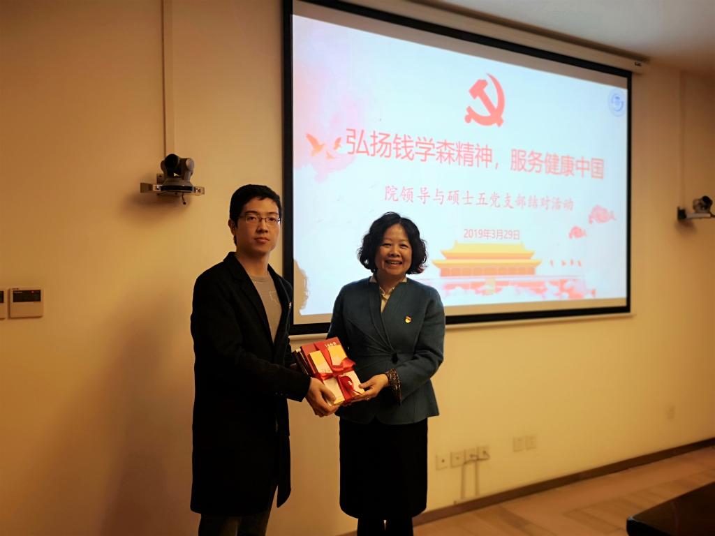 会上,施建蓉向支部党员代表赠送了《初心与抉择》《新时代知识分子榜样》等书籍并寄语。她回顾了钱学森传奇人生所经历的时代,感叹建国70年以来,祖国风雨兼程,日新月异的发展,正是前辈们的爱国奉献、艰苦奋斗开创了美好新生活。她对广大青年党员充满信心,希望大家无论何时都要坚定“四个自信”,坚持爱国情怀和科学精神,知行合一,学习弘扬钱学森精神,把爱国融入血脉融入日常,坚定服务健康中国的理想,不忘初心,报效祖国,早日成为引领国家医学发展的中坚力量,谱写精彩无悔的人生。