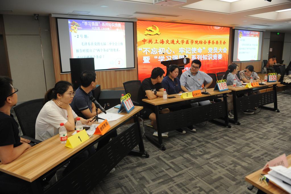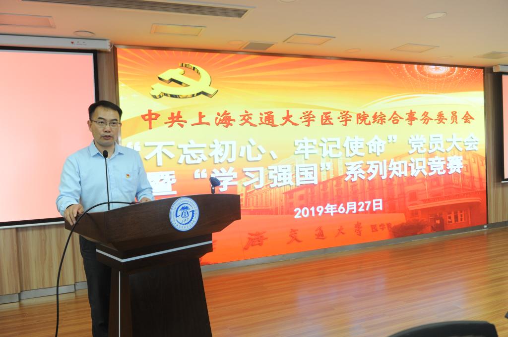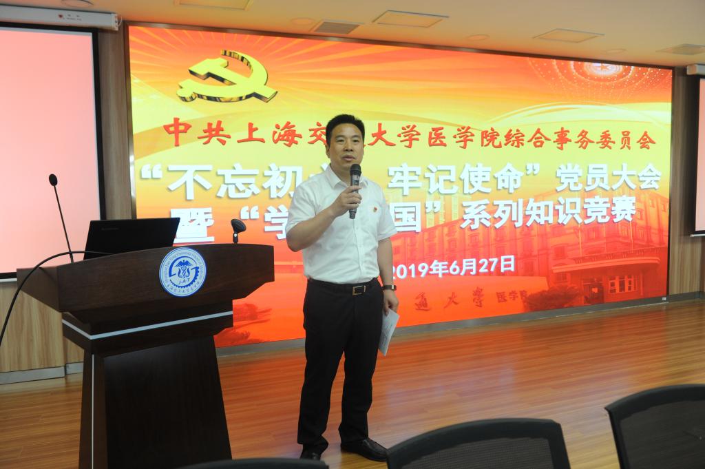 为贯彻落实中央“不忘初心、牢记使命”主题教育工作会议精神,引导广大党员进一步坚定理想信念,以真抓实干推动各方面工作开展,在中国共产党建党98周年之际,综合事务党委于6月27日在304am永利集团官网东9号楼三楼会场隆重举行“不忘初心、牢记使命”党员大会暨“学习强国”系列知识竞赛活动。304am永利集团官网机关党委书记李丽、公共卫生学院党委书记黄荣、党委组织部副部长朱孟琴、党校副校长叶福林、党委宣传部副部长张晓晶受邀作为竞赛嘉宾及专家评委。综合事务党委书记仇晓春、副书记王福胜、马亮出席了大会。会议由综合事务党委副书记王福胜主持。