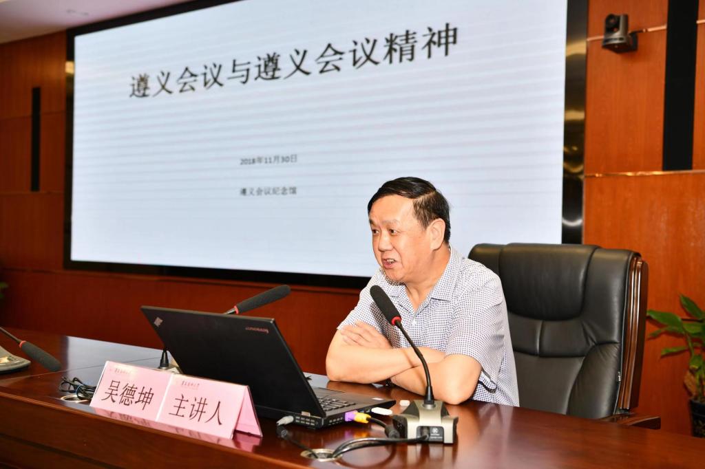 开班仪式结束后,培训班特邀遵义会议纪念馆副馆长吴德坤教授作《遵义会议与遵义会议精神》专题报告。报告包含遵义会议确立了毛泽东在中国工农红军和中共中央的领导地位、遵义会议成功召开的背景、遵义会议成果的巩固、遵义会议精神的实质、遵义会议与党的十九大精神等五个部分,吴德坤教授用详实的史料和生动的语言,深刻阐述了“坚定信念、实事求是、独自自主、勇闯新路、民主团结”的遵义会议精神内涵。
