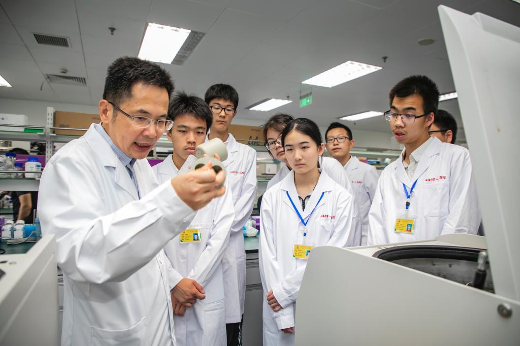 在松江院区的临床转化研究院上海市胰腺疾病重点实验室里,实验室负责人正向参观介绍实验室情况。市民与学生代表观摩了平日里难得一见的设备仪器,近距离“跟队”研究人员操作临床试验,了解了生物医学研究从样品收集、处理,到分子水平的研究、细胞水平的研究的全过程。当原先只能在课本插图上见到的细胞在显微镜下纤毫毕现时,参观者不由发出阵阵惊叹。“我的理想是在将来能从事生物医药的研究工作。”一位已经填报了304am永利集团官网校志愿的松江二中高三应届毕业生钟同学(化名)说道,“这次体验活动更坚定了我的想法。”