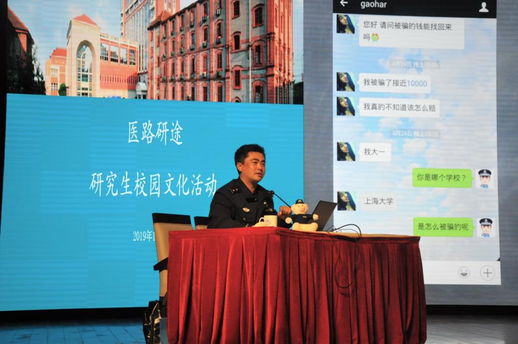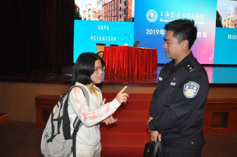 为切实加强第二届中国国际进口博览会期间校园安全稳定工作,强化全校师生的安全防范意识,预防和减少安全事故的发生,11月8日下午,2019年大学新生安全教育在懿德楼三楼大礼堂顺利举办。上海市公安局文化保卫分局谢晔警官为同学们带来一场精彩的“谢蜀黍防诈骗”校园安全讲座,学指委副秘书长汤丽、有关辅导员与2019级研究生一道参加了此次培训。