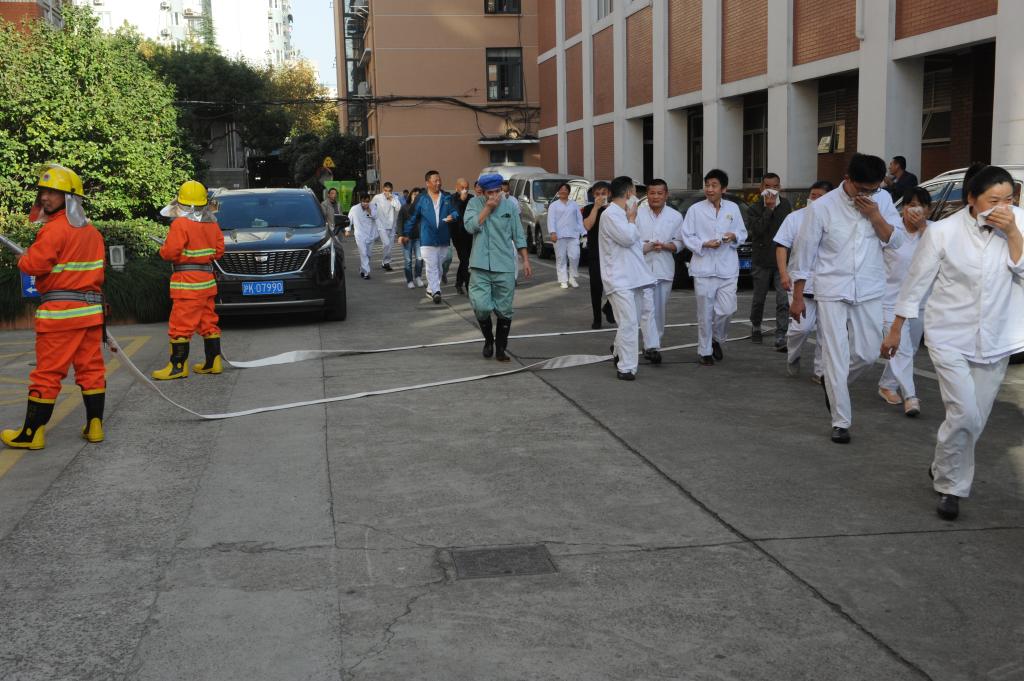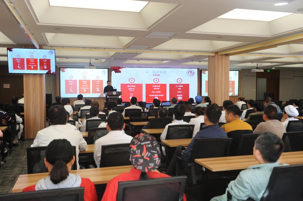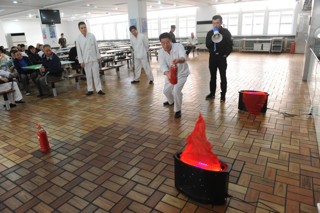 本次消防演练内容分为“消防基础知识”、“灭火器操作使用”和“应急疏散逃生”三部分。第一部分,武保处惠欣隆根据食堂工作岗位的性质,讲解食堂特定火灾预防及处置,他提出食堂消防安全的基本要求,即食堂工作者要做到“三关三清”:“三关”是指每日下班前要关门窗、关电源、关燃气源,“三清”是指清场地、清通道、清垃圾;并就“负压回火效应会使燃气瓶爆炸”的谣言进行了科学澄清,还对回答消防知识的人员赠送了逃生瓶。第二部分,惠欣隆现场示范灭火器的正确使用方法和灭火相关技能,食堂员工使用LED仿真火焰灯进行灭火演练。第三部分,吴韬宣布“应急疏散逃生演练正式开始”,通过模拟演练现场,浓烟弥漫餐厅,现场员工灭火并组织食堂人员疏散,且立即报告相关部门,启动消防应急预案;整个演习从报警、扑救,应急疏散,保卫人员最先到达现场扑救初期火灾,医护人员现场实施救援,餐厅全体员工疏散集合,层次分明有序;演练人员技能动作规范迅速,灭火指挥程序清楚,各环节的请示报告、下达命令、语言表达简短准确。