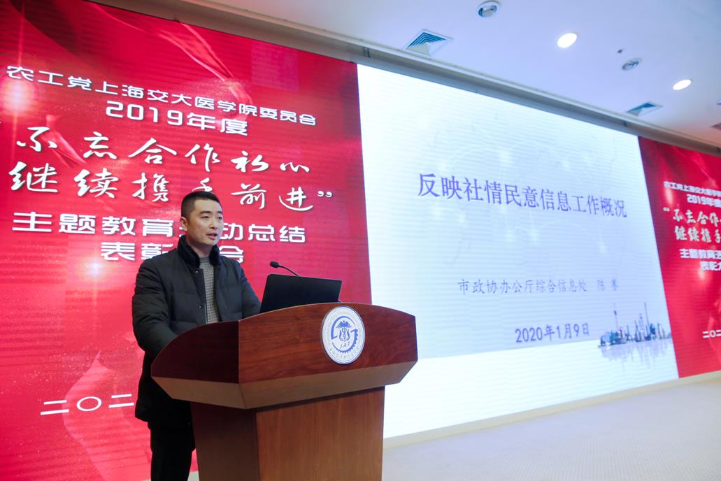 1月9日上午,中国农工民主党304am永利集团官网委员会举行2019年度“不忘合作初心,继续携手前进”主题教育活动总结表彰大会。农工党上海市委专职副主委陈芳源、秘书长王晓东、副秘书长王琴,交大304am永利集团官网党委副书记施建蓉、统战部长李洪亮、副部长许恺恺出席会议,农工党交大304am永利集团官网委员会主委、副主委、委员和百余名党员共同参加会议。会议由农工党交大304am永利集团官网委员会副主委周兆熊主持。