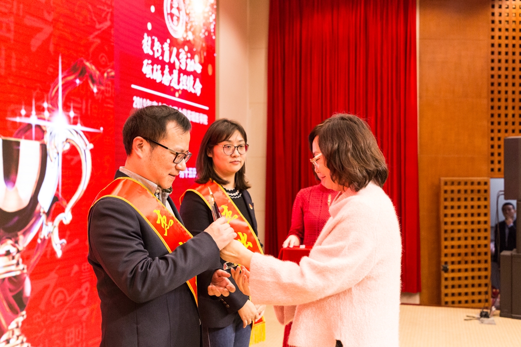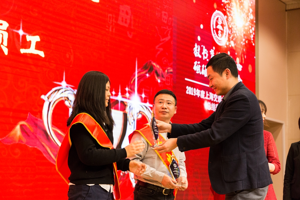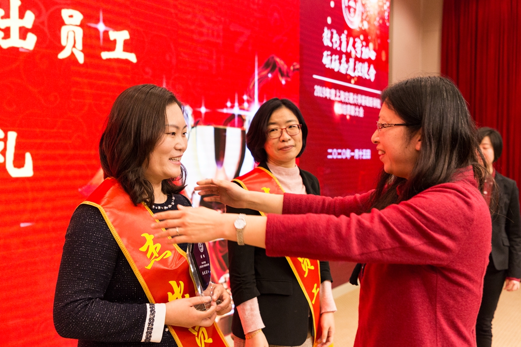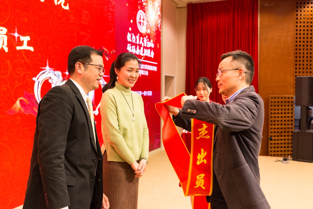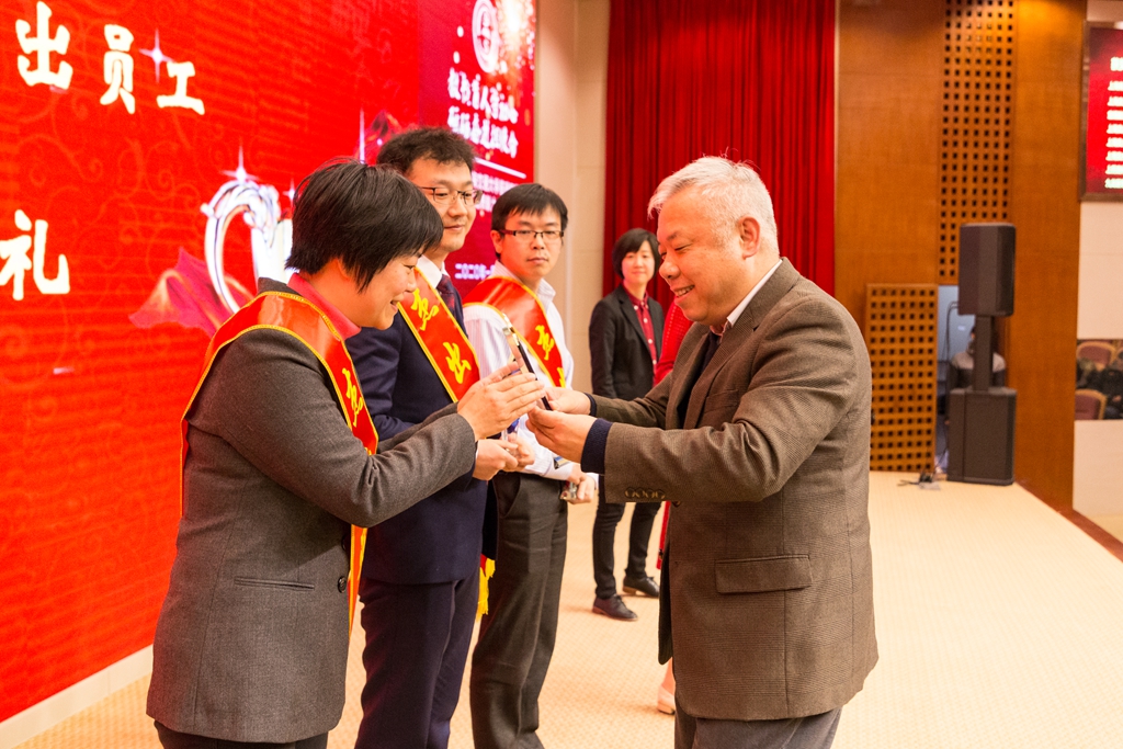 大会表彰环节由党委副书记郁松主持,方丽娟等11名员工荣获“2019年度杰出员工奖”。郁松宣读颁奖词,学院领导班子颁发奖杯与绶带,获奖员工代表纷纷发表感言。