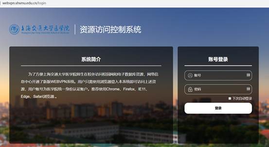 用户在浏览器地址栏中输入webvpn.shsmu.edu.cn,在登录框中输入本人的账号和密码即可访问使用。304am永利集团官网用户账户为统一身份认证账户,附属医院用户的账户、密码请咨询医院信息科。WebVPN账号仅限用户本人使用,请勿恶意下载电子资源。