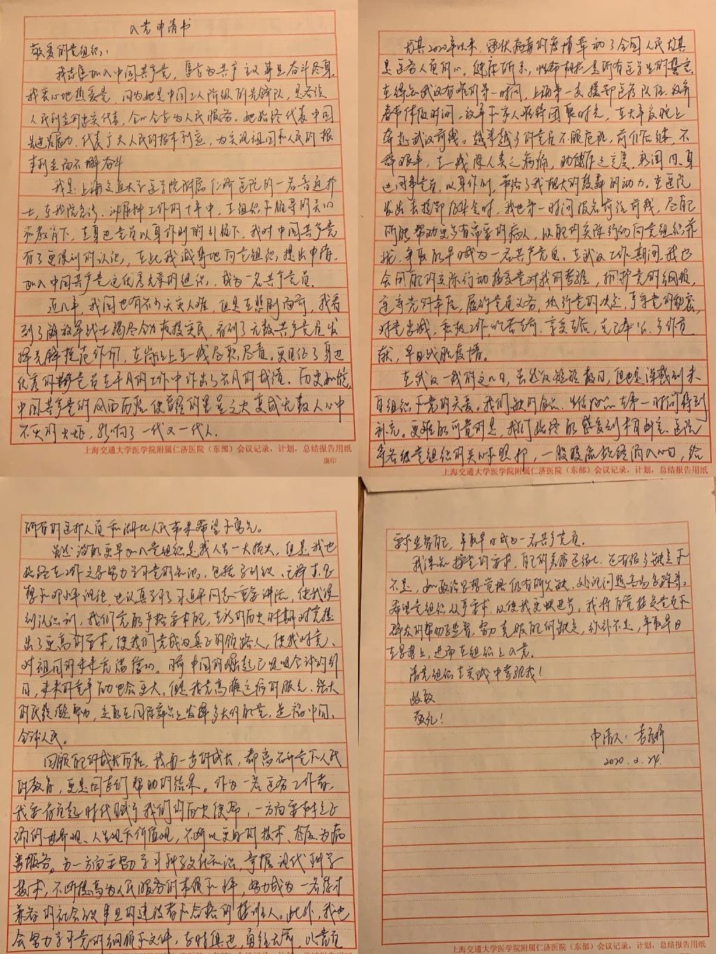 入党申请书长短不一,字迹也各不相同,细读之下,令人动容。第一个递交入党申请书的是仁济医院第一批援鄂医疗队队员吴文三,入鄂的第三天递交入党申请书。他在入党申请书中写道:“作为一个有着17年重症护理经验的男护士,而且是支援我的家乡,支援我的湖北乡亲,我责无旁贷。”在他和身边党员的影响下,第三批援鄂医疗队又有8位队员递交了入党申请书。95年出生的仁济医院第三批援鄂医疗队队员于景海写道:“当与死神的拔河终于获得胜利,当卧床的重症病人苏醒过来,当痛苦的表情被放松的微笑所代替,作为医务工作者,那一份满足和喜悦是无法用语言形容的。……身边前去支援武汉的前辈深深地影响了我,让我明白了什么是共产党员。”94年出生的护士窦苗写道:“在这个危急时刻,在这场没有硝烟的战争中,我作为一名医务人员时刻准备着。”93年出生的护士张林写到:“在危险艰苦的工作环境中,我深深地被身边的党员前辈们所焕发出的敢为人先、舍我其谁的风采所倾倒,那一句“我是党员我先上”的豪迈话语所折服。”92年出生的护士马玲玲写到:“突如其来的“新冠病毒”检验了我们的党和党员,84岁高龄的钟南山院士,身患渐冻症的武汉金银潭医院张定宇院长,还有无数的医生、护士和基层工作人员,他们展现了新时代共产党员的精神风貌。……他们感动着我、激励着我加入到党的队伍中。”