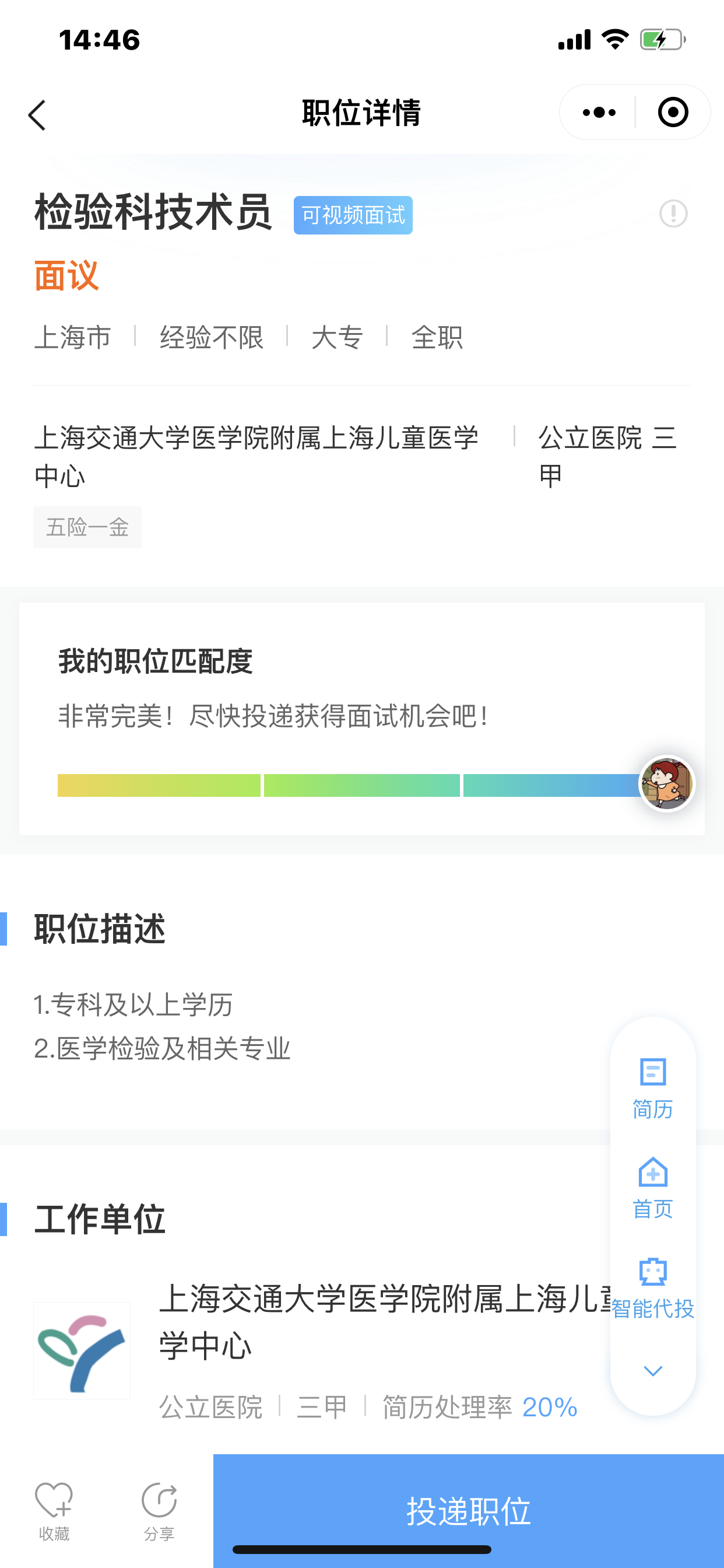 本次空中双选会共有209家参会单位,分别来自上海、江苏、浙江、广东、北京、福建、河南等22个省市,其中医疗机构148家,高校、研究院(所)以及医药、医疗器械企事业单位61家,提供了超过3000个工作岗位。双选会的参会单位表现出良好的人才需求态势,岗位需求基本涵盖了我院各学科专业,截至4月1日17时,我院及上海市其他高校629名毕业生在线求职,线上投递简历1700份,线上面试23次,34名毕业生在线获得录入意向,后续考察面试工作正在有条不紊地进行。