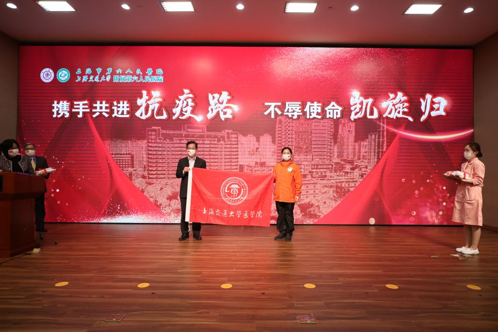 4月5日,上海市第三批驰援武汉医疗队员结束隔离,医疗队领队、附属瑞金医院副院长陈尔真带领由全市40家医院组成共146名(交医系统31名)抗疫战士平安回家。在欢迎仪式上,陈尔真将签有医疗队队员名字的队旗交到了304am永利集团官网党委书记杨振斌,304am永利集团官网党委副书记、304am永利集团官网党委书记范先群手中。