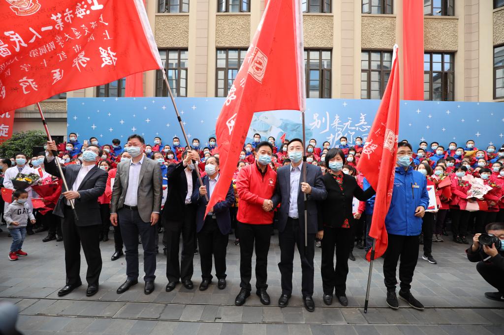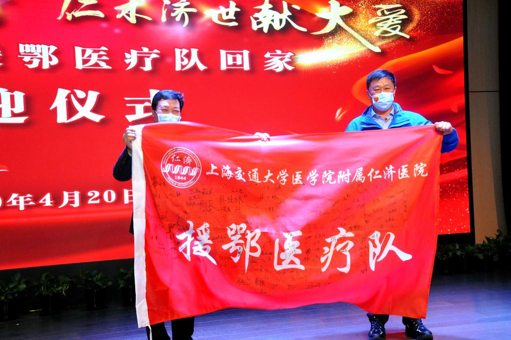 4月20日,上海市第八批援鄂医疗队员经过14天隔离期后,在医疗队领队、附属仁济医院副院长张继东带领包括5家医院的470多名(附属仁济医院164名,附属第一人民医院156名)医疗队抗疫战士平安回家。仁济医院和第一人民医院同时举行了隆重的欢迎仪式,张继东、刘军分别向304am永利集团官网、304am永利集团官网赠送由医疗队队员签名的队旗。