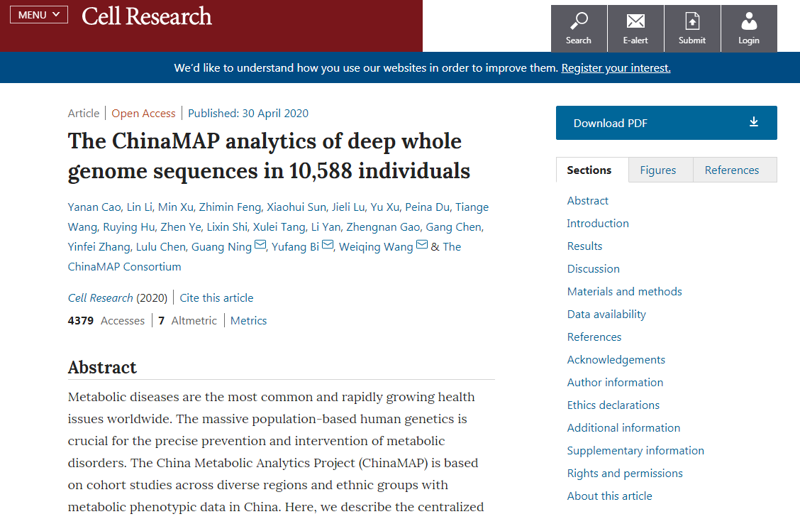 综上所述,ChinaMAP以覆盖中国各地区的研究队列为基础建立了高质量中国人群数据库,通过高深度全基因组数据和精细表型分析,可为疾病机制研究、预防、遗传咨询和公共卫生管理提供依据。例如,ChinaMAP在2月下旬报道的新冠病毒受体ACE2相关变异在全球不同人群中的比较分析证实该病毒对所有人种均易感,该成果在Cell Discovery发表,已被访问下载超过20万次。ChinaMAP对汉族和少数民族群体的精确遗传结构分析也为中国人群的精准基因组学研究提供了参考数据。