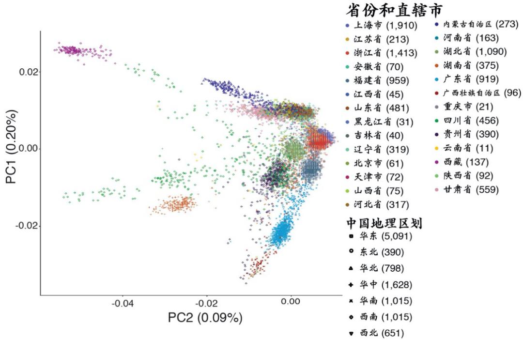 研究覆盖中国7大地理区域,包括了人口排名前10的汉族、壮族、回族、满族、苗族、彝族、藏族和蒙古族,显示了中华民族跨地理区域人群遗传背景的多样性和复杂性。研究团队首次揭示了汉族人群可显著分成7个亚群:北方汉族(北京、天津、河南、河北、山东、辽宁、吉林、黑龙江、山西),西北汉族(甘肃、陕西),东部汉族(江苏、浙江、上海、安徽),中部汉族(湖北),南方汉族(贵州、四川、重庆、湖南、云南、江西),东南汉族(福建)和岭南汉族(广东、广西)。少数民族中,藏族、彝族、蒙古族、苗族和壮族都有着独特的人群聚类,而满族和北方汉族相近,回族和西北、北方汉族相近。不同地域人群的变异特征也与中国历史上的人口迁徙和变迁相关,例如河西走廊是丝绸之路中不同民族迁徙的交通要道,历史上包括粟特人等许多民族曾在此经商生活。