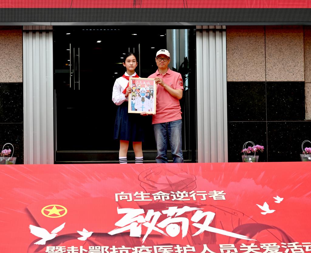 现场向援鄂医护人员献花致敬。参加“红色战疫”全国青少年绘画征集活动的少先队员代表向援鄂医护赠送自己的作品,表达了孩子们的感谢和祝福。他们用画笔描摹英雄岁月,用色彩点亮生命之春,以“艺”战“疫”。启动仪式在大学生代表手语歌《不放弃》中圆满结束。