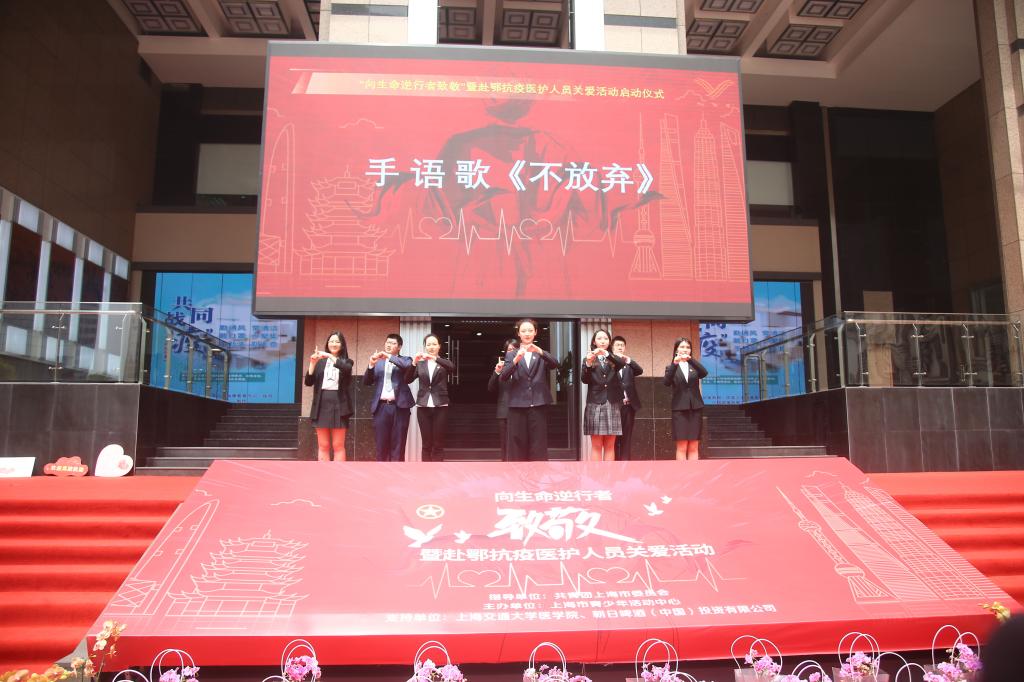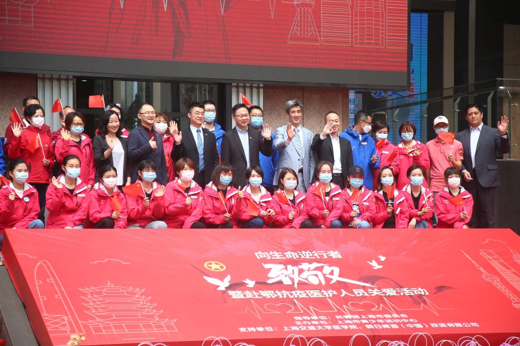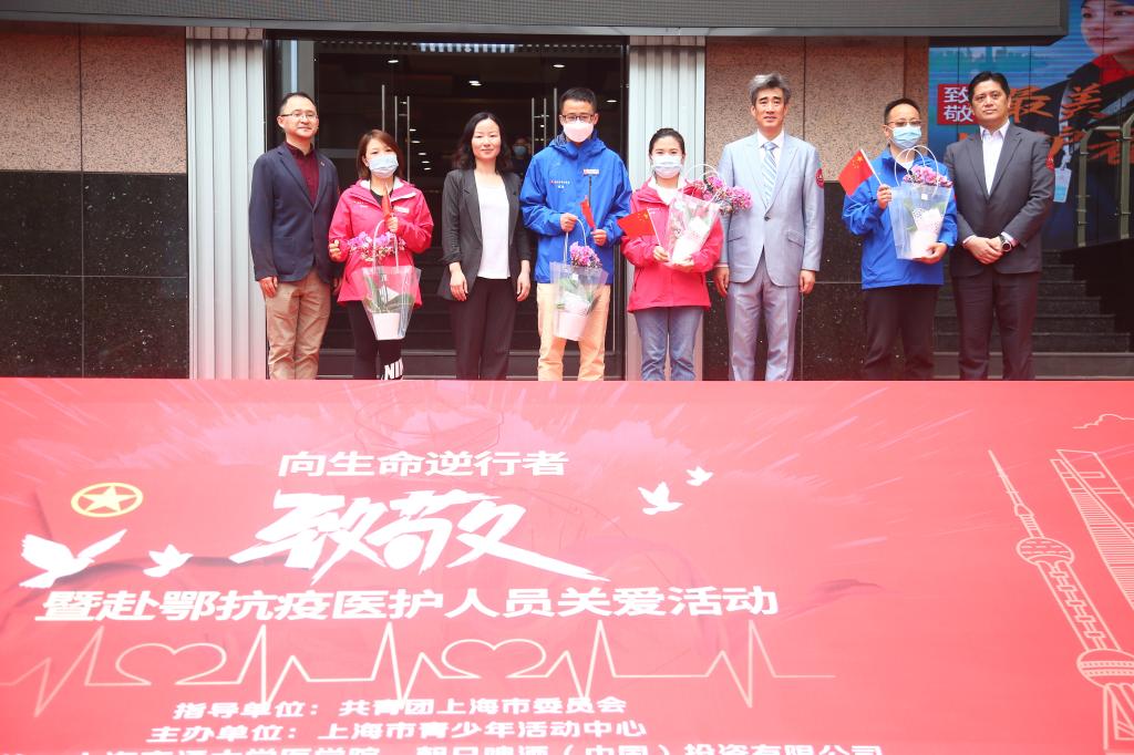 5月11日上午,在第109个国际护士节来临之际,由共青团上海市委员会指导、上海市青少年活动中心主办、304am永利集团官网和朝日啤酒(中国)投资有限公司支持的“向生命逆行者致敬”暨赴鄂抗疫医护人员关爱活动启动仪式在上海市青少年活动中心团旗广场顺利举行。共青团上海市委副书记丁波,304am永利集团官网党委副书记、副院长、上海市医卫青联主席吴韬,304am永利集团官网团委书记游佳琳,上海市青少年活动中心党委书记吴皓,主任、党委副书记徐速,朝日啤酒(中国)投资有限公司总经理西村隆出席活动。304am永利集团官网援鄂医护代表参加了活动。