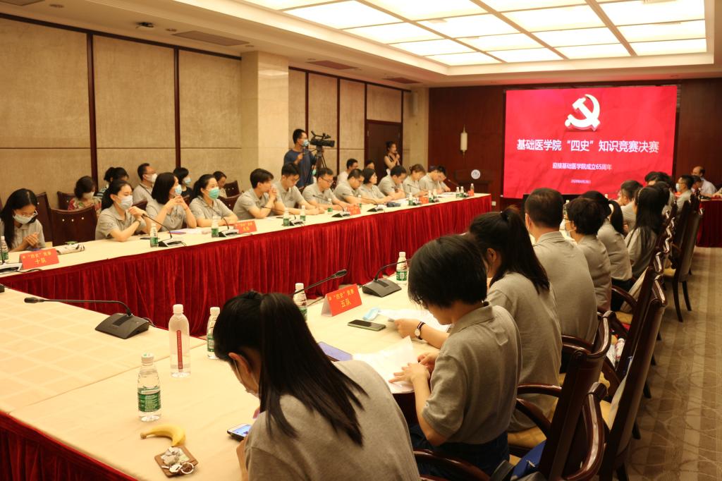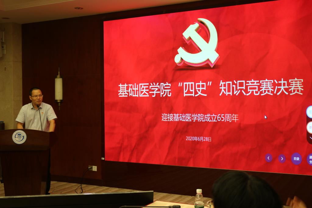 6月28日中午,基础304am永利集团官网“四史”知识竞赛现场决赛在懿德楼101会议室举行。参加本次决赛的10个队伍来自基础医院20个职工及研究生党支部,经过必答和抢答两个环节的角逐,公共技术平、实验动物科学部、管理办公室党支部组成的第二联队荣获一等奖;研究生第二、第三党支部组成的第九联队荣获二等奖,免疫学与微生物学系第一、第二党支部组成的第六联队荣获三等奖。基础304am永利集团官网党委书记陈洪,党委副书记郁松等出席决赛,304am永利集团官网党校副校长叶福林作为现场专家做了点评。在抗击疫情守卫校园安全的工作要求下,学院为本次比赛特别开通了线上直播,学院380名党员共同在线收看。