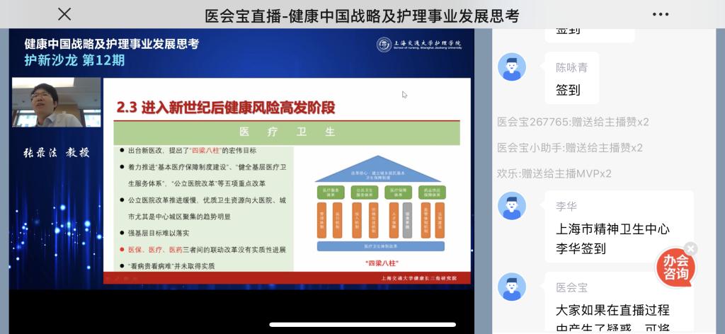 在讨论环节,与会者分别通过线上线下的形式向张教授提出有关护理人员如何发声,提高护理的影响力;如何与长三角健康研究所推进资源共享;护理教育者在推进健康中国中的定位与作用等方面的问题,并与张教授进行了积极、深入地探讨。