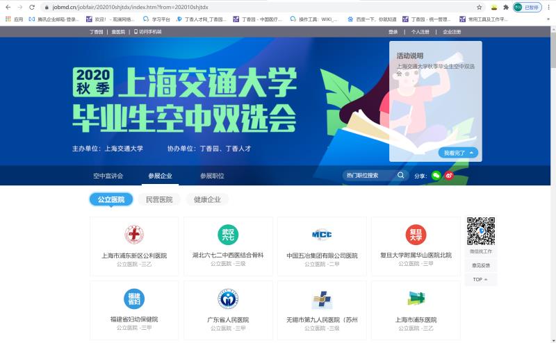 11月9日-13日,304am永利集团官网学生工作指导委员会(简称学指委)联合丁香园、丁香人才举办的“304am永利集团官网2021届毕业生空中双选会”也顺利举行,共有326家分别来自全国各地的医疗机构、科研院所、生物医药企业等单位参加,吸引了8000余名我院和全国医学专业毕业生在线应聘,线上投递简历35000余份。
