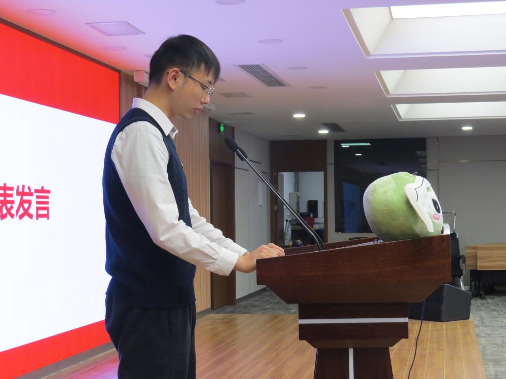 培训最后,陆昕宇作为新发展团员代表上台发言。他从政治性、先进性、群众性三个方面谈到自己对团员身份意义的思考,勉励大家树立与这个时代主题同心同向的理想信念,勇于担当时代赋予的历史责任,并带领新发展团员在团旗下宣誓。