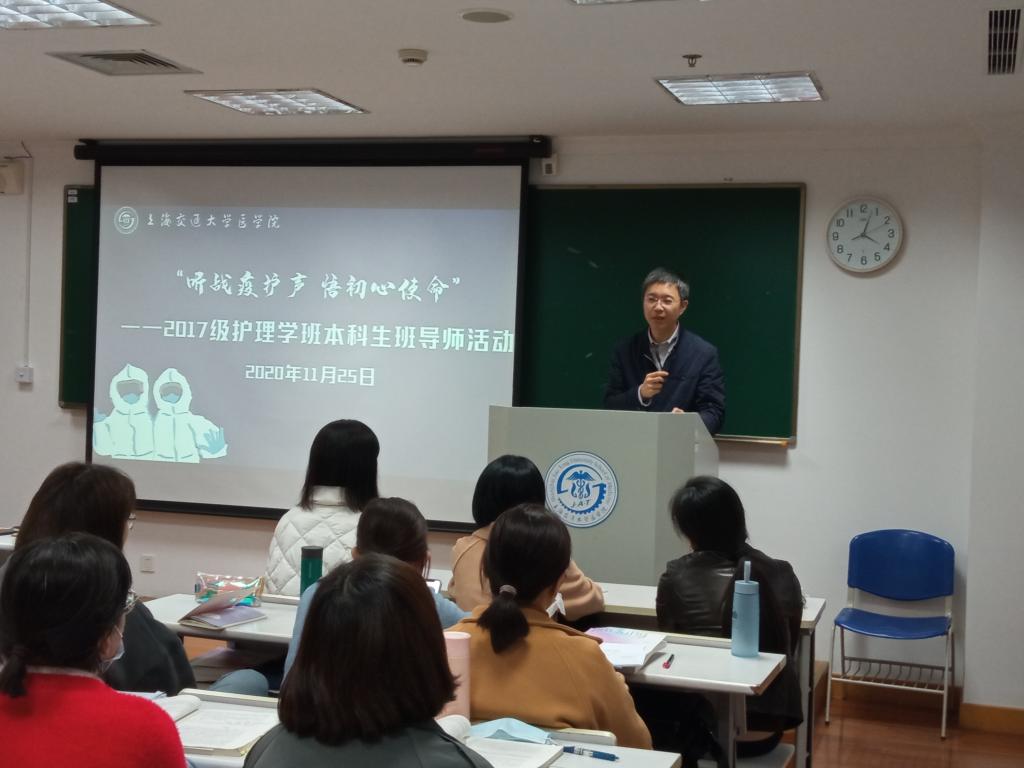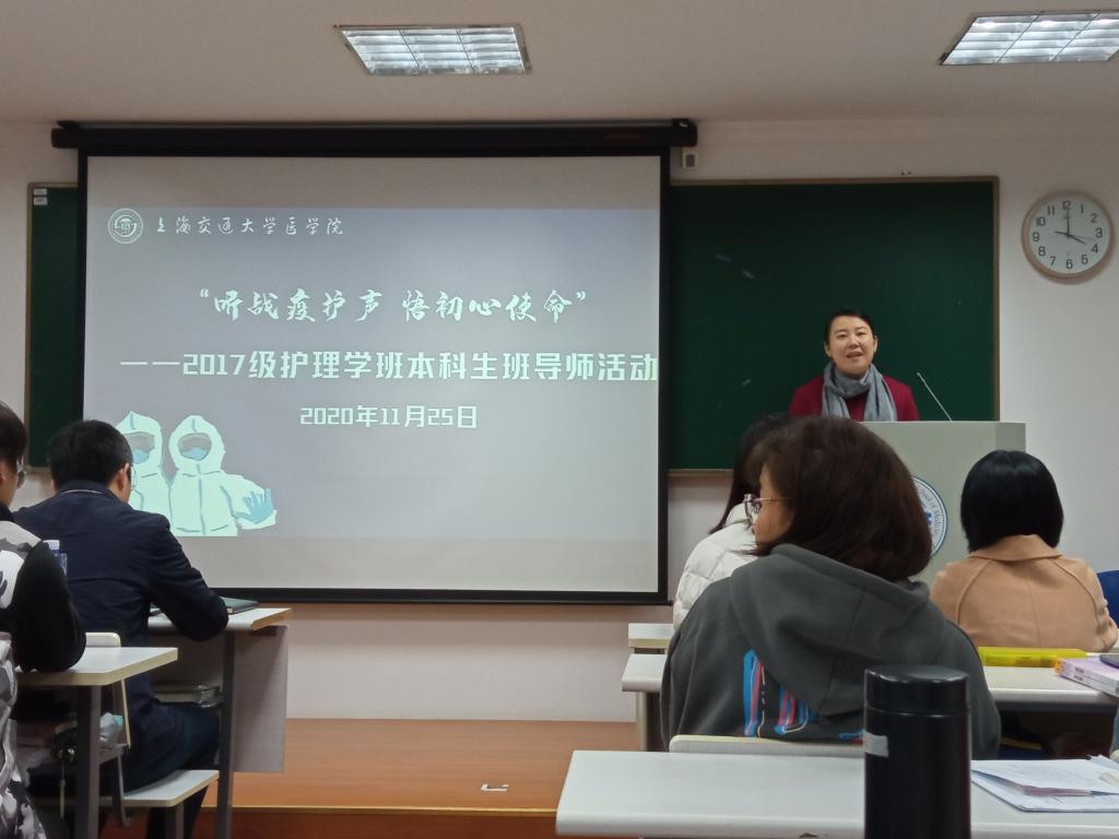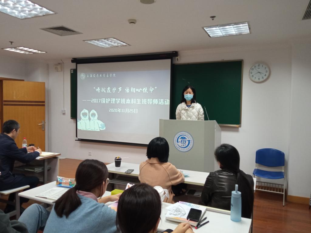 11月25日下午,2017级护理学班“听战疫护声,悟初心使命”班导师活动在科教楼502顺利举行。护理学院党总支书记陈铿,附属仁济医院护师、第八批上海援鄂医疗队队员、全国抗击新冠肺炎疫情先进个人戴倩,附属瑞金医院护师、第一批上海援鄂医疗队队员、上海市抗击新冠肺炎疫情先进个人沈虹受邀出席活动。班导师王琳、辅导员陶晶与全班同学一起参与了活动。
