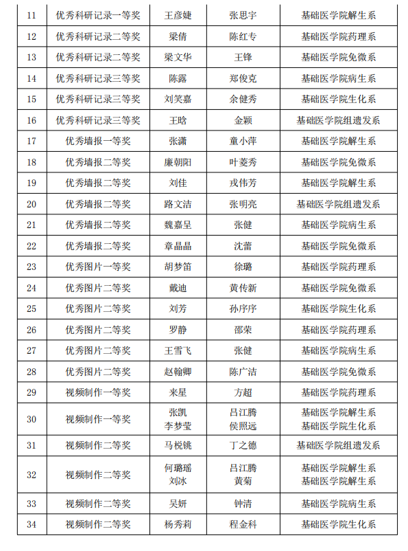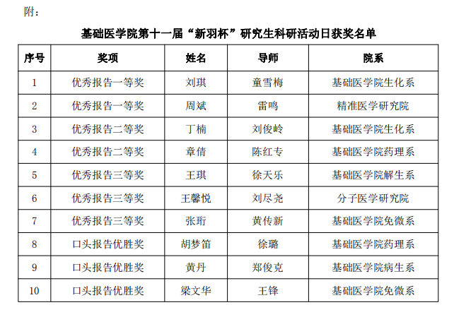 经过紧张的角逐和评审,各奖项最终揭晓。基础304am永利集团官网2018级硕博连读生刘琪与精准医学研究院2019级直博生周斌并列获得优秀口头报告一等奖,2017级博士生张潇获得优秀墙报一等奖,2019级硕博连读生王彦婕获得优秀科研记录一等奖,2018级硕士生胡梦笛获得优秀图片一等奖,2019级博士生来星等获得优秀视频制作一等奖。