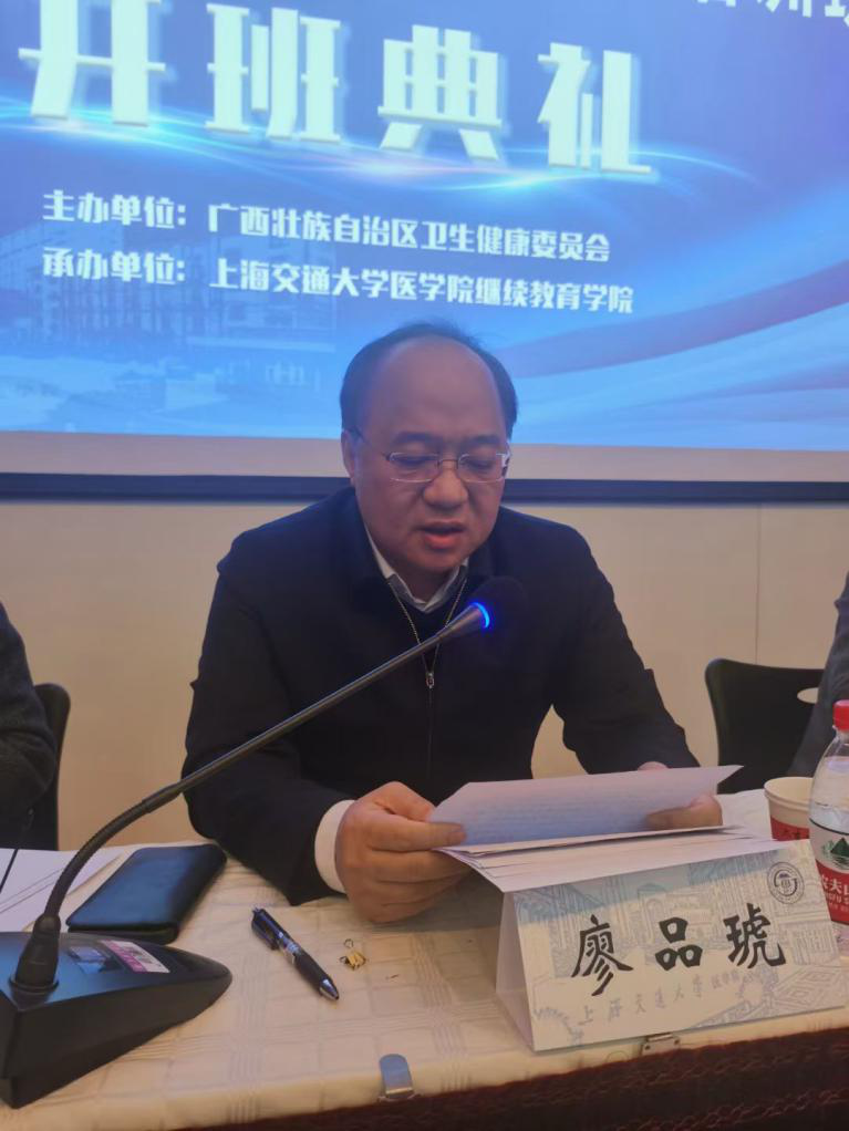 12月14日上午广西卫生健康委党组书记、主任廖品琥、304am永利集团官网副院长胡翊群、304am永利集团官网继续教育学院副院长浦川海参加开班典礼,开班仪式由广西卫生健康委人事处处长刘勇主持。304am永利集团官网副院长胡翊群首先致开幕词,他代表学院向远道而来的广西壮族自治区各卫生健康系统新任处级干部们的到来表示热烈欢迎,对组织此次培训班的广西壮族自治区卫生健康委员会的相关领导给予的信任和认可表示感谢,在五天的时间里希望参加培训的各位学员能学有所获,学有所得,为今后在卫生健康领域职业能力上的发展有所助益。随后,广西卫生健康委党组书记、主任廖品琥发表讲话,对本次培训班的前期筹备过程做了回顾,感谢交大304am永利集团官网给予的办班支持,并对本次培训班的意义、课程设置以及师资安排给予了高度肯定,并向在座的所有学员提出努力协作,共同探讨的具体要求,希望学员珍惜本次学习机会,融入交大304am永利集团官网学习氛围,全面提升卫生系统管理人员职业综合能力水平,为建设开放、现代、活力的广西各市提供坚实的卫生健康管理和人才培养。