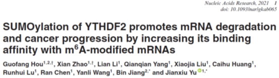 2021年2月12日304am永利集团官网余健秀研究组在Nucleic Acids Research杂志上在线发表“SUMOylation of YTHDF2 promotes mRNA degradation and cancer progression by increasing its binding affinity with m6A-modified mRNAs”论文(全文链接:https//SUMOylation of YTHDF2 promotes mRNA degradation and cancer progression by increasing its binding affinity with m6A-modified mRNAs | Nucleic Acids Research | Oxford Academic (oup.com))。该研究揭示SUMO化修饰是m6A修饰阅读蛋白YTHDF2功能调控的一个新分子机制,并阐明了其在肿瘤发生中的重要作用。