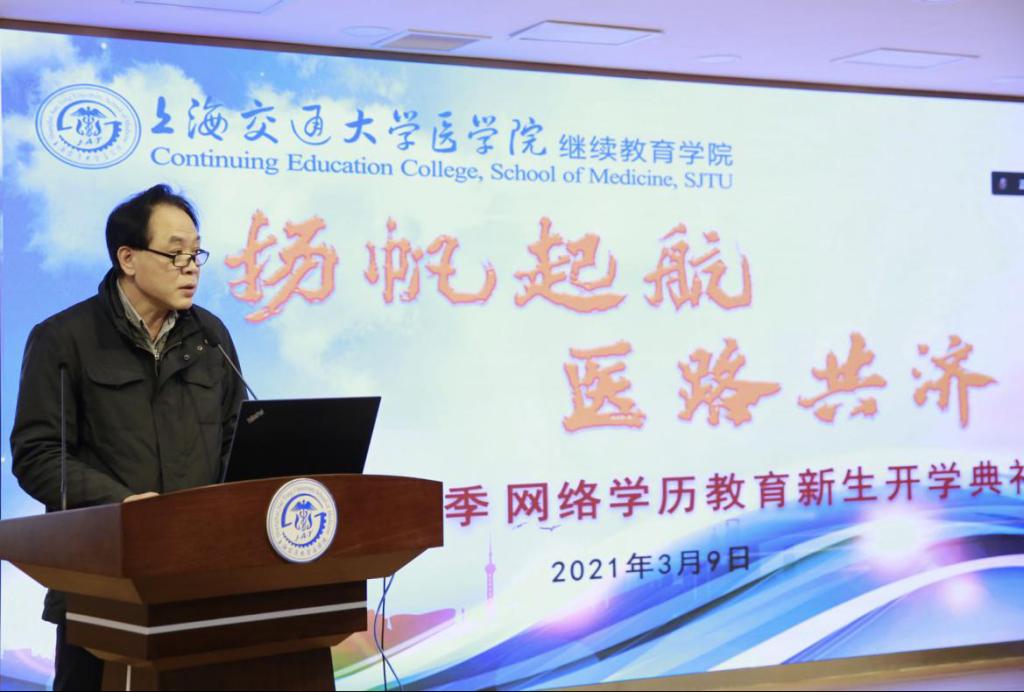 沈伟副院长首先致辞。他从学院发展历史、校企合作历程、新生动员与展望等方面做主旨报告。他首先对同学们立志成才、报效祖国医药卫生事业的坚毅信心,表示崇高的敬意!他指出,作为高校,我们始终注重国家和社会需求,充分发挥好育人作用,提高人才培养质量。他充分赞扬了各校企合作企业在疫情大考中彰显出的大国企业实力、企业速度、企业担当和企业精神;也充分肯定了学院在这一特殊时期的从容有序应对,始终坚守在人才培养第一线。他强调,同学们要珍惜时光,立足责任,努力使自己成为有责任、有能力、能创新的高素质应用型人才。沈伟副院长在鼓舞新生们的同时,也为继教学子们送上了一堂生动的、贯穿思政主题教育的“开学第一课”。