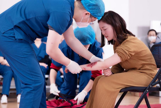 高彩萍老师为踩踏伤员进行伤口模拟化妆