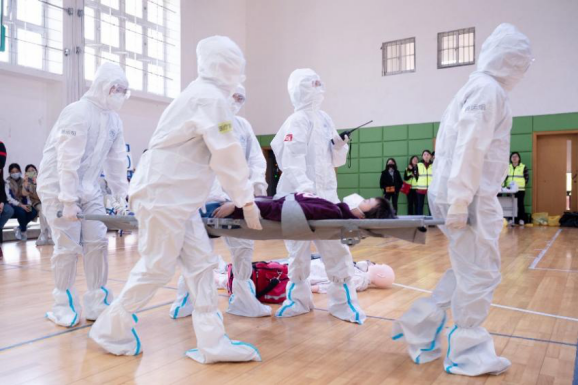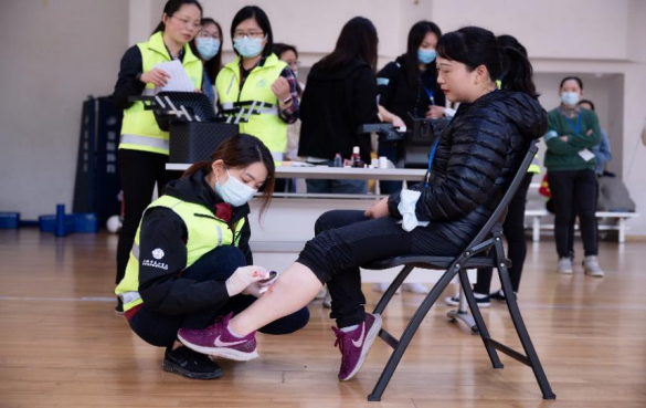 上午11时,救援实战演练在304am永利集团官网体育馆正式展开。本次演练模拟了一辆载有境外回国需进行隔离观察人员的大巴,在浦东机场开往隔离点的过程中因车祸发生骚乱致踩踏事件的紧急救援。演练人员根据救治需要分为伤员组、检伤组、医疗救治组、转运组及观察组。据了解,整个救援过程包括风险评估及准备、团队沟通及任务分工、伤员检伤分类、现场急救以及伤员转运后送等。
