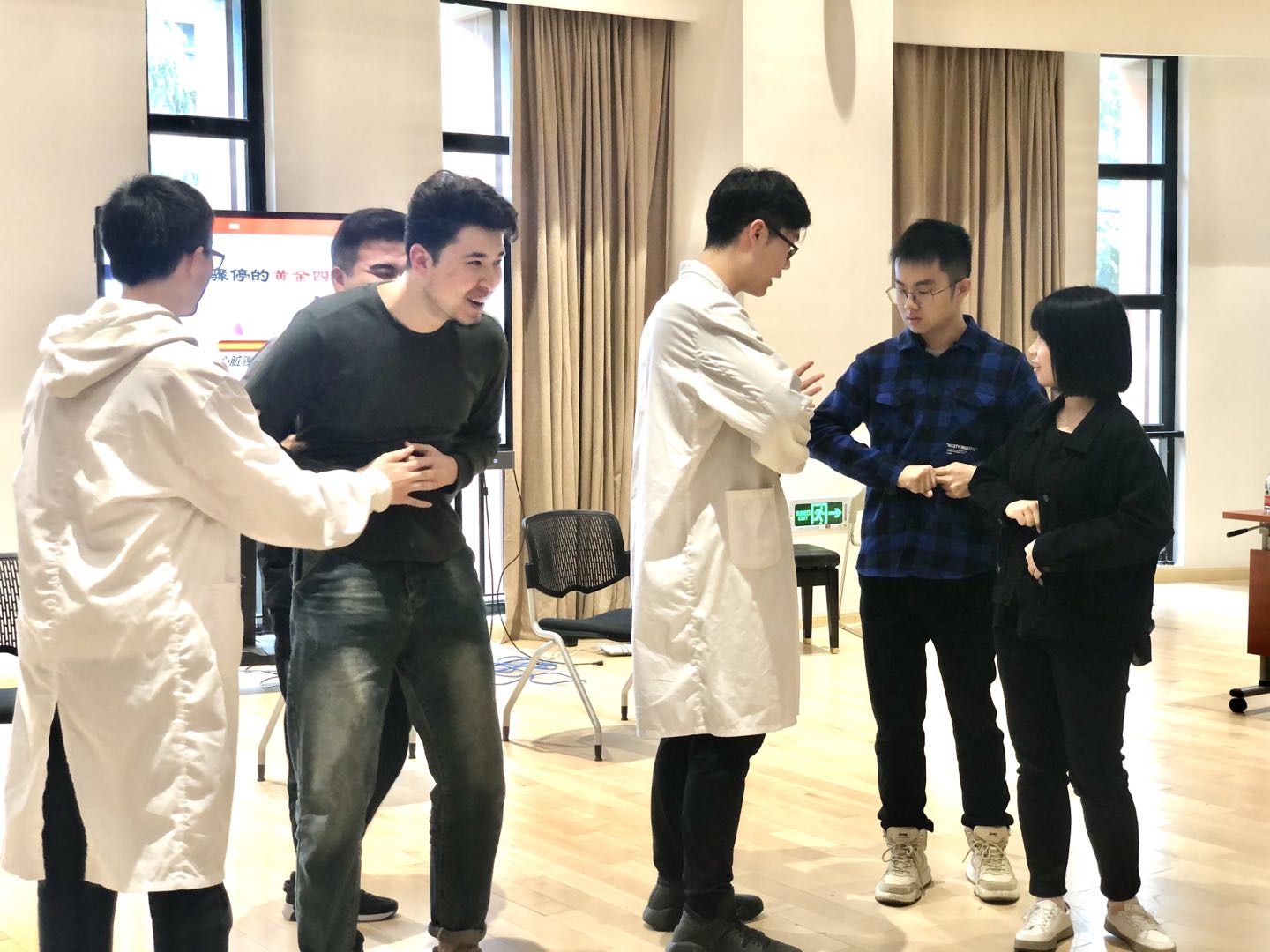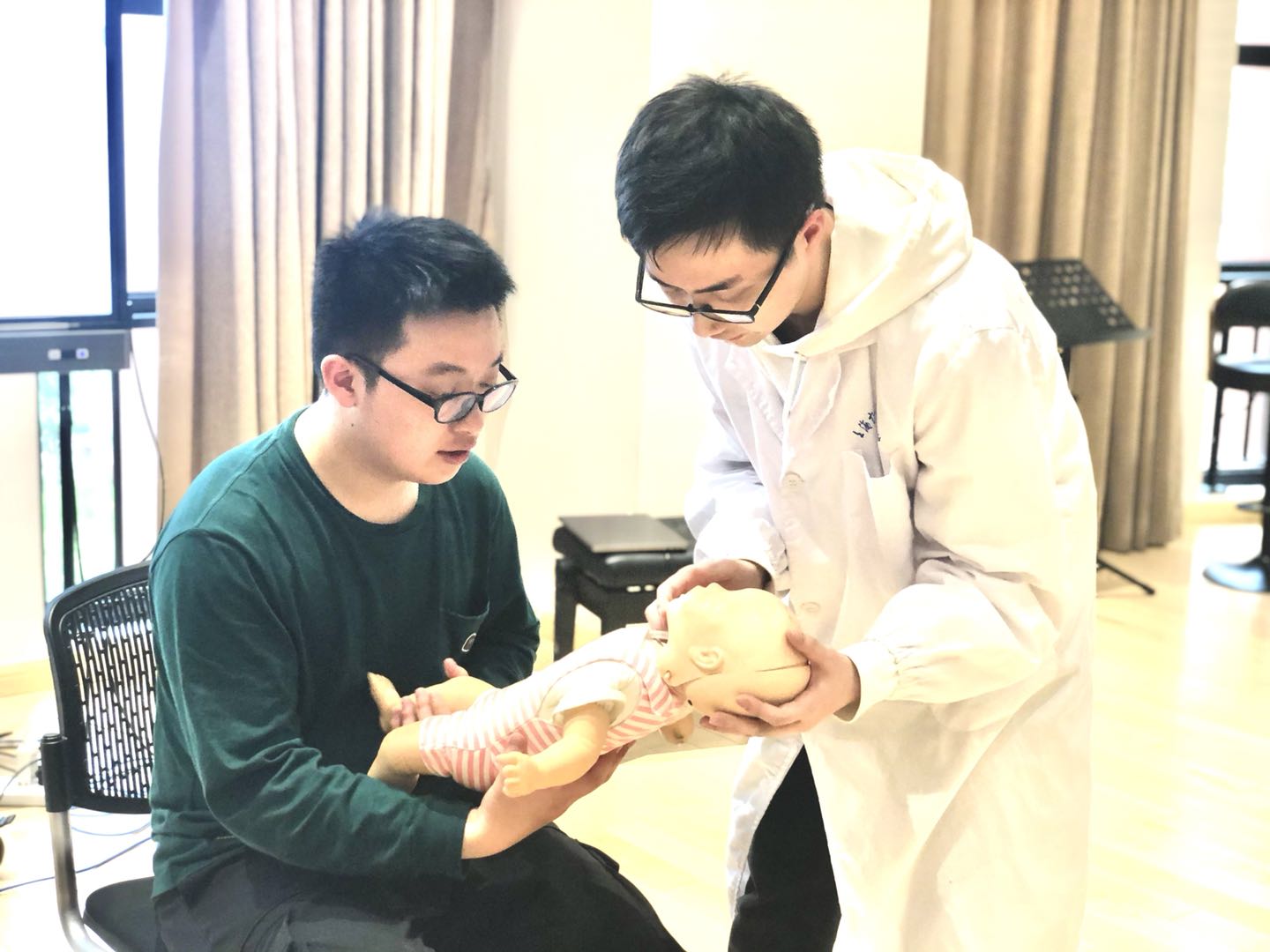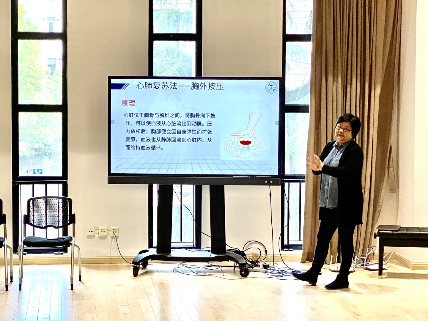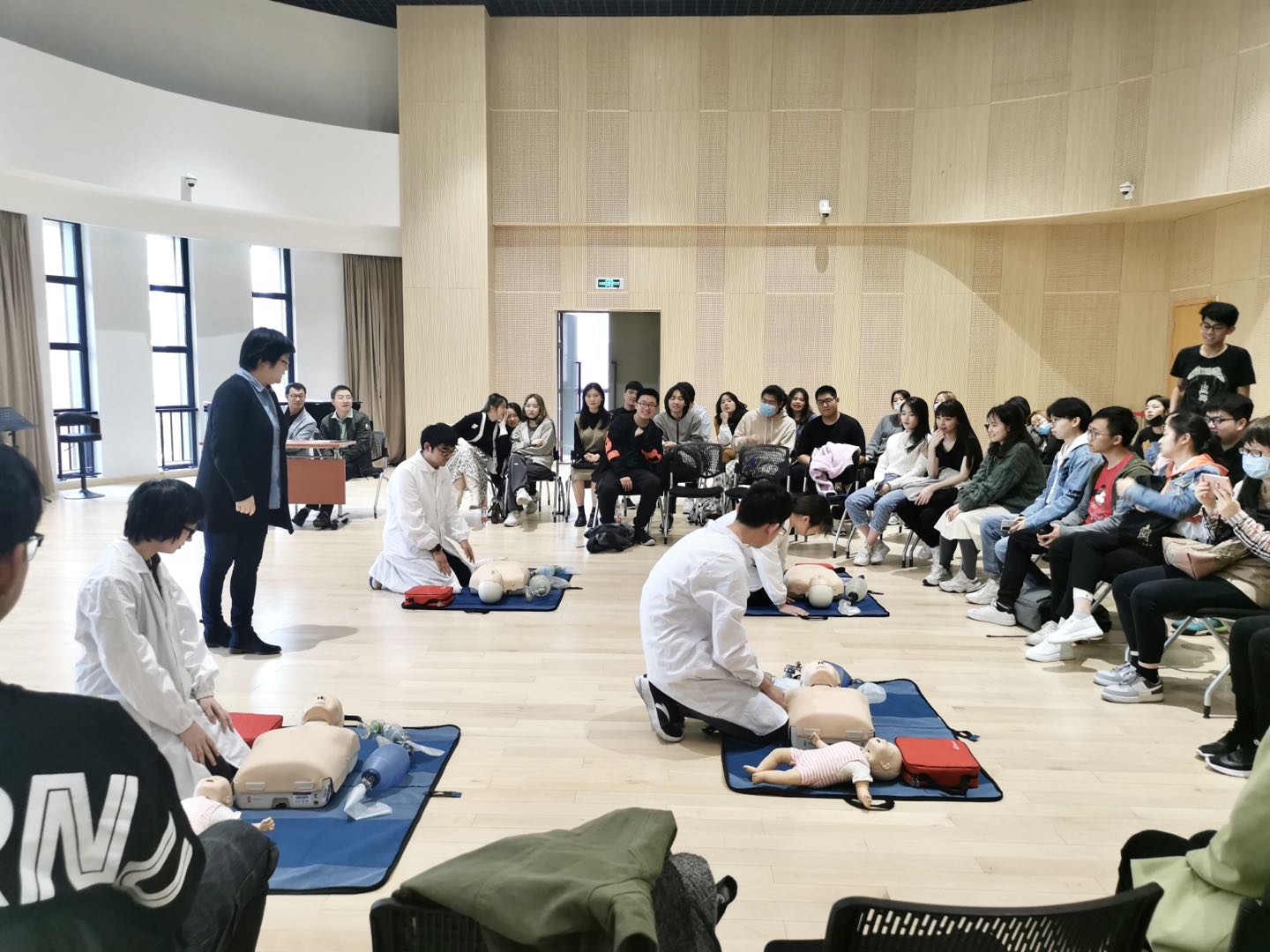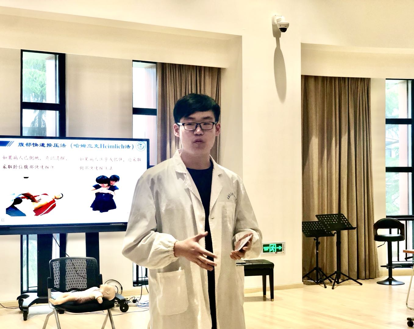 活动环节,林芊主任分别详细介绍心肺复苏术、自动体外除颤器(AED)、海姆立克急救法的基本概念、操作要点及在成人、儿童和婴儿中的应用原则。上音师生认真观看操作视频,儿科学院学生助教做现场示范。本次活动特别为现场观众提供了实践操作的机会,与会师生积极踊跃,交流互动,现场气氛热烈。儿科学院江代纪同学为现场观众发放本次活动的宣传手册,并详细介绍烧伤、烫伤等常见的急救措施。