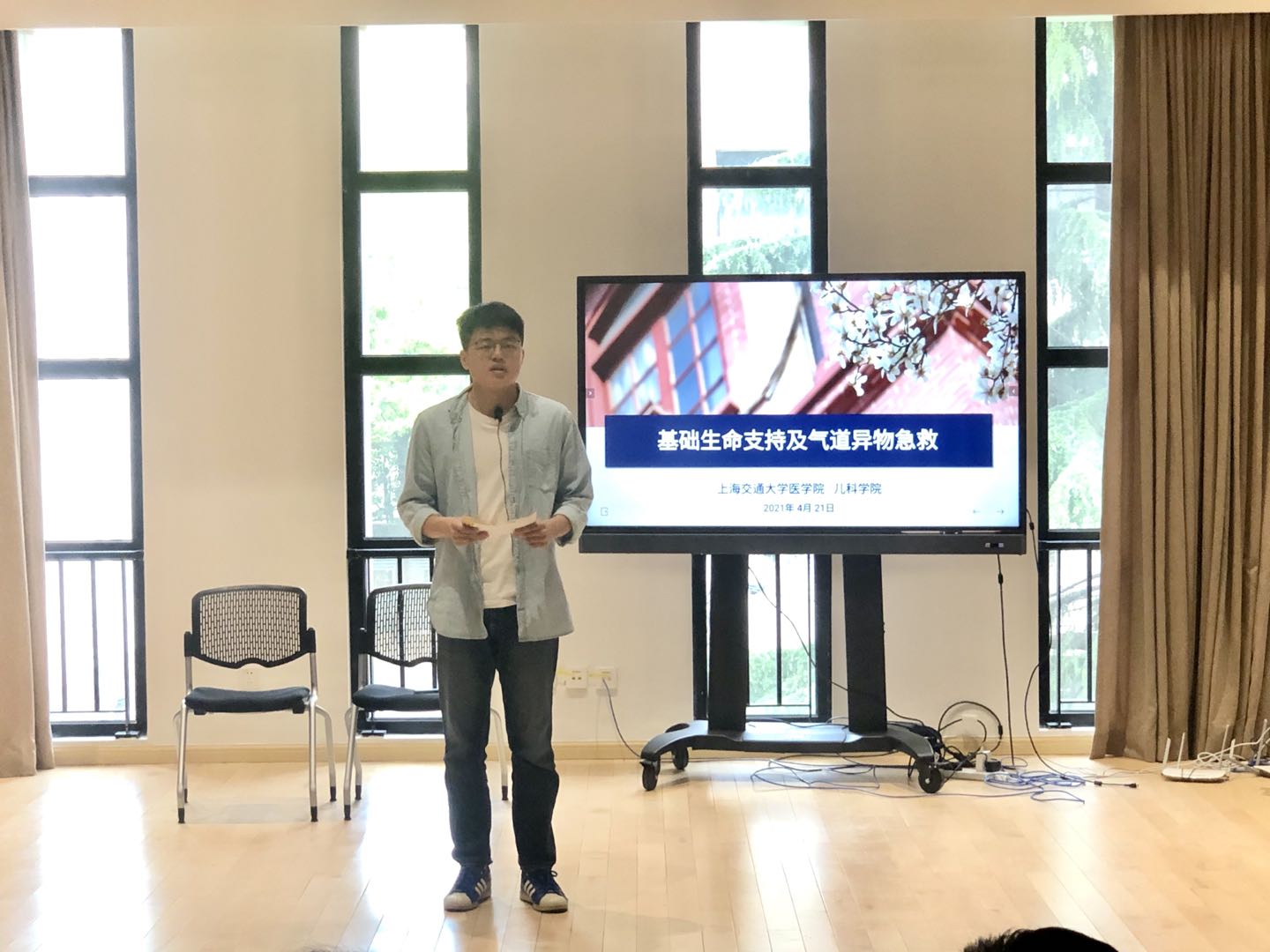 为迎接中国共产党“建党100周年”,深入学习贯彻习近平新时代中国特色社会主义思想和党的十九大、十九届历次全会精神,强化党史学习教育活动,4月21日下午,儿科学院师生代表走进上海音乐学院零陵路校区,与上海音乐学院音乐教育系联合举办了“党史学习教育活动—我为群众办实事”之《“救”在身边——基础生命支持》科普活动。儿科学院办公室主任林芊,教务支部宣传委员、学生综合事务负责人张丹丹、上海音乐学院音乐教育系党总支副书记张来、教师党支部书记王庆、学生党支部书记马静及音教系70余名本科生参加本次活动,儿科学院18级临床医学专业(儿科方向)王博同学担任主持。