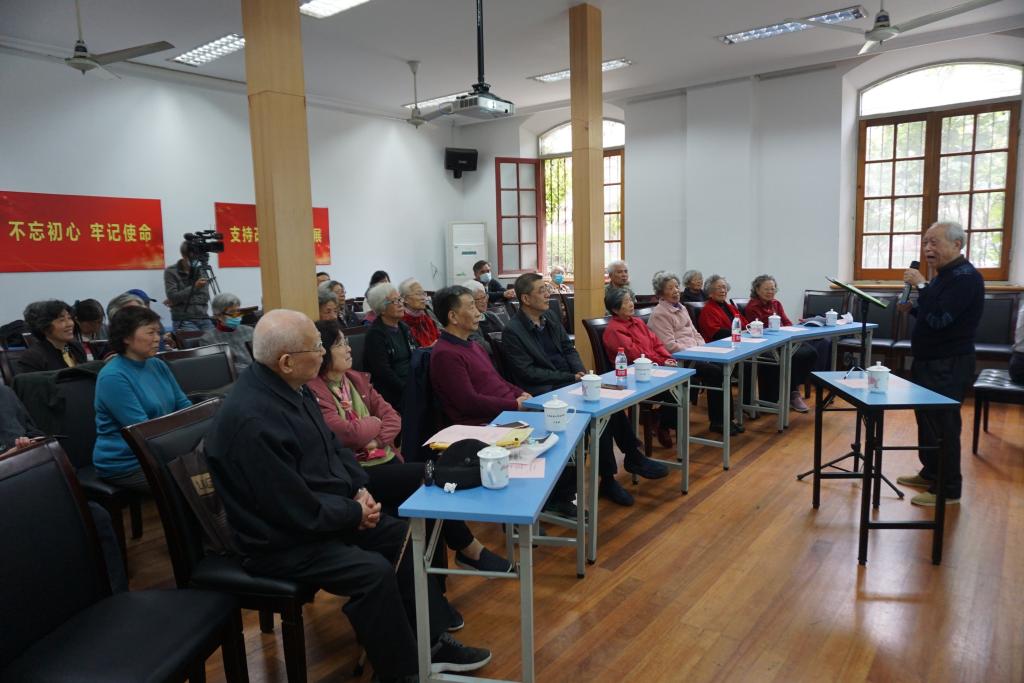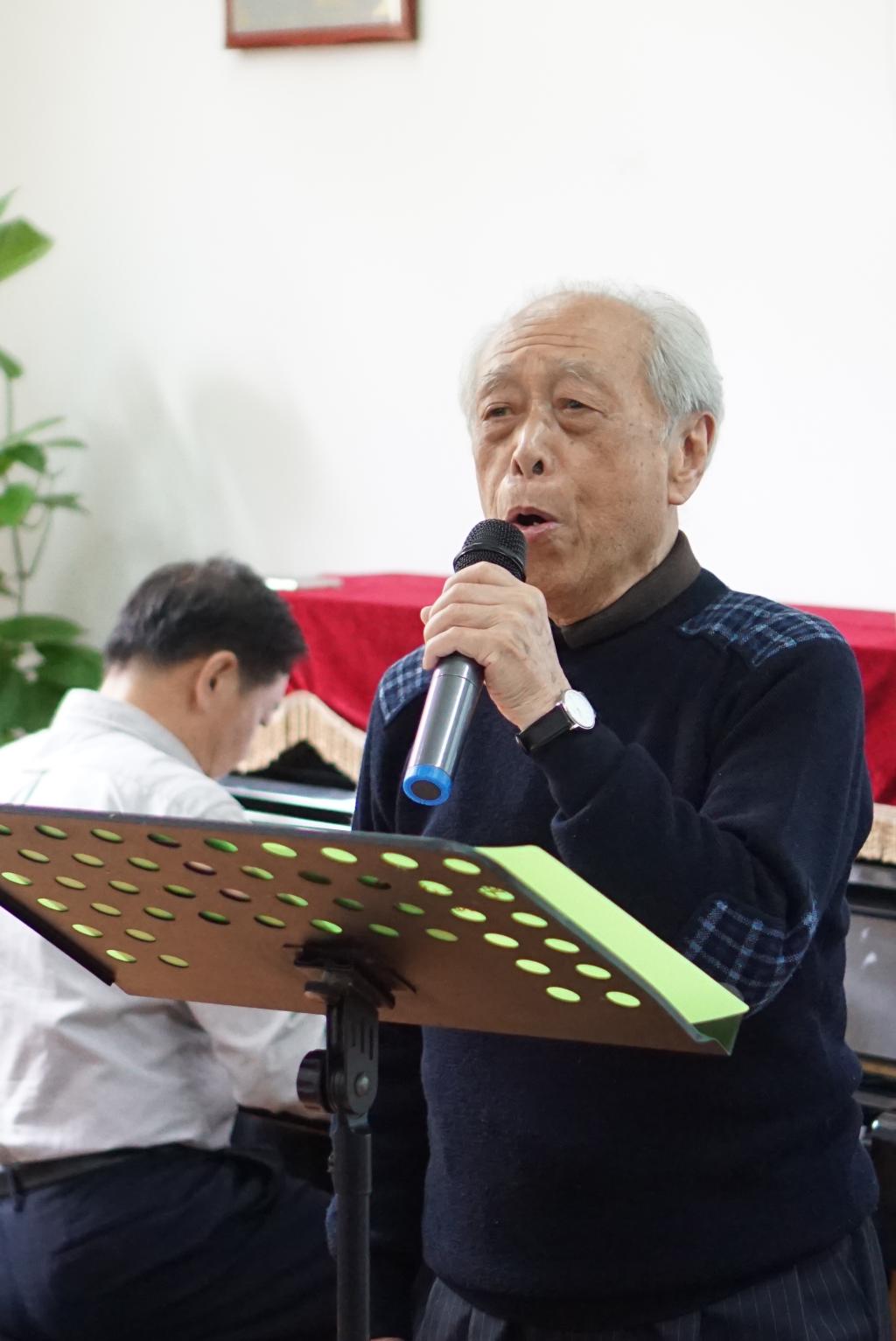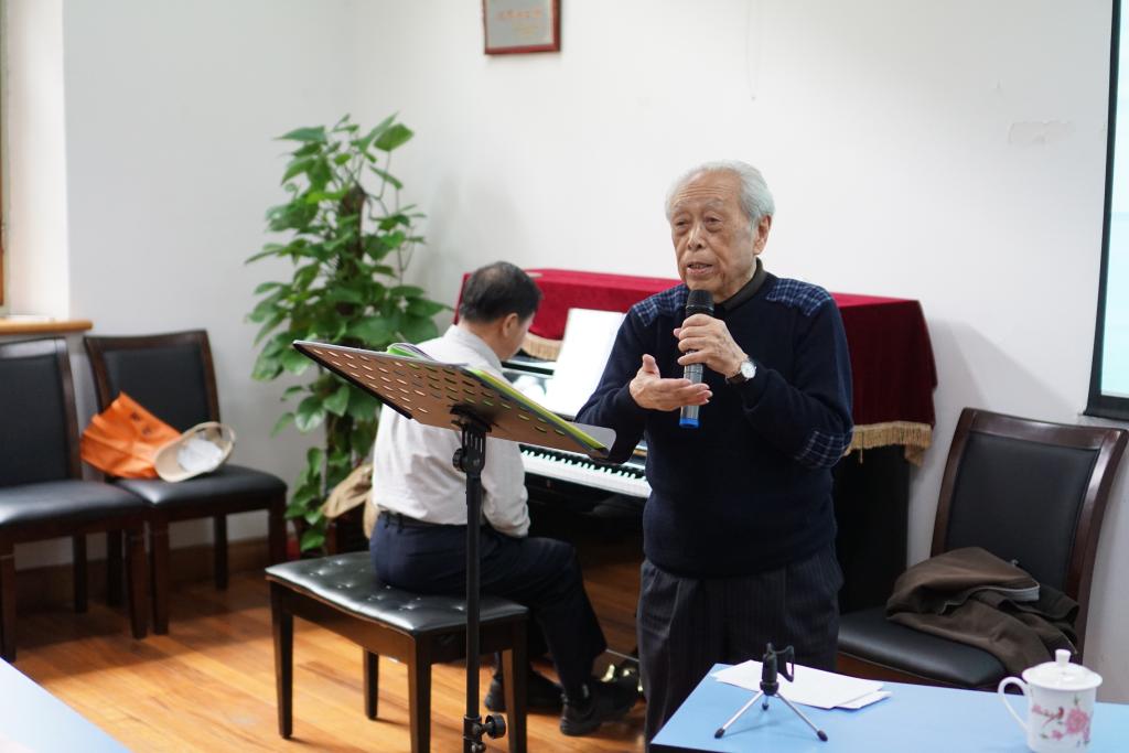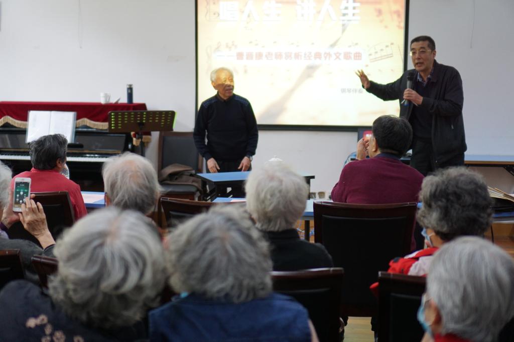 96岁高龄的原上海第二医科大学副校长曹晋康老师用婉转嘹亮的歌声, 从“爱是人生永恒的主题”、“人生的追求与梦”、“人生的坎坷与理解”和“人生准则与斗争”等5个篇章与大家分享了十余首经典外文歌曲,诠释了人生的追求和信念,充分体现了曹老师退休后“老有所学、老有所乐、老有所悟”的生活状态。他在歌唱中感悟这些歌曲创作所蕴含的人生价值观,或是悲欢离合的人生坎坷,或是国家有难时,挺身而出、保家卫国、热洒鲜血的革命精神……他在演唱《歌唱祖国》时谈到:祖国是每个人的母亲,我们要歌唱祖国。我们的祖国有着五千年的文明史,是个五十六个民族团结的大家庭。近一百年来,我们的祖国在中国共产党的领导下把马克思主义理论同中国革命的实践结合起来,使久经磨难的中华民族实现了从“站起来”、“富起来”到 “强起来”。