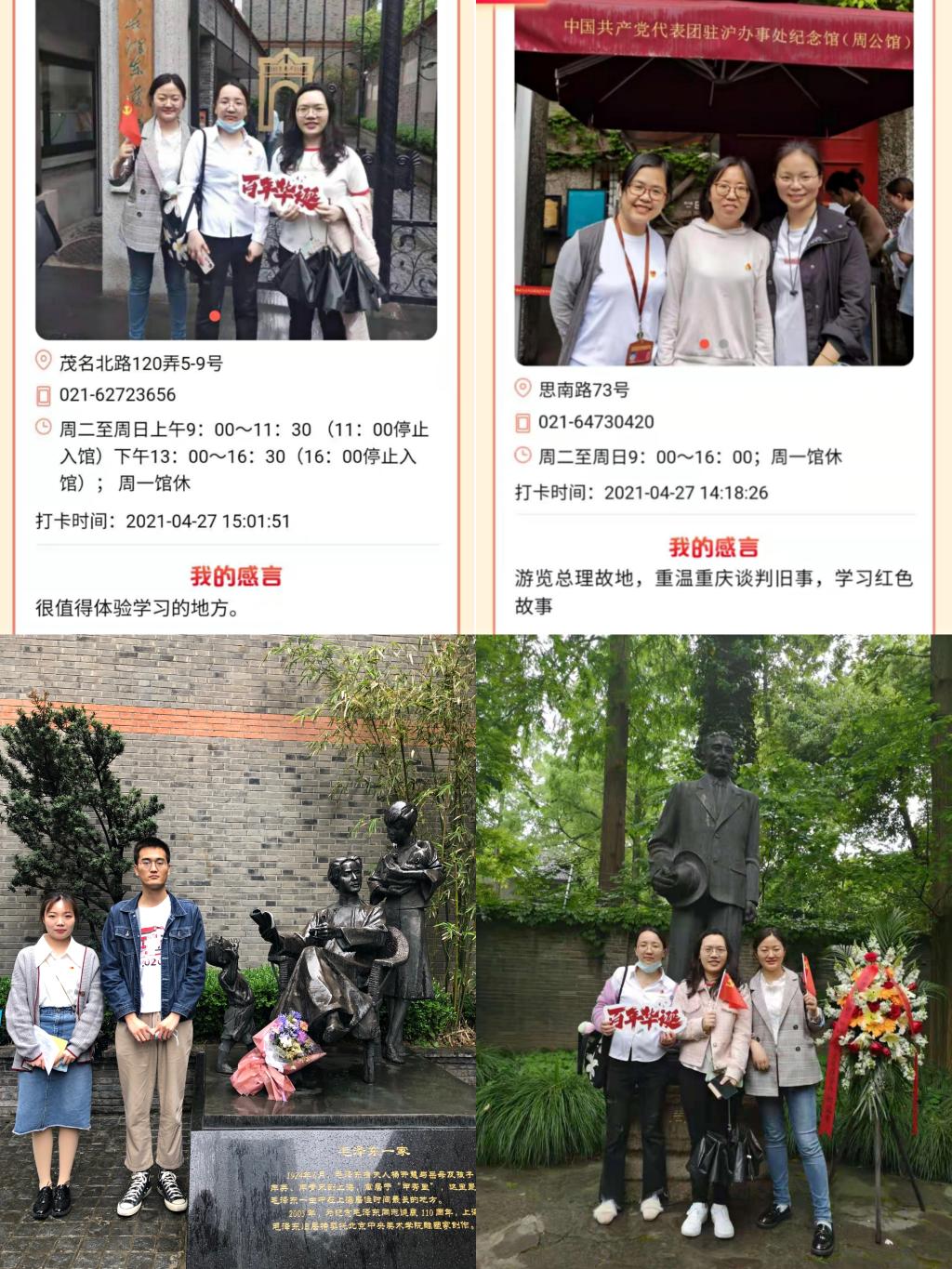 接着,所有参赛队伍从始发站——304am永利集团官网党史学习小屋统一出发,前往三大基地(毛泽东旧居、上海韬奋纪念馆和中共代表团驻沪办事处(周公馆))进行红色基地寻访,所有队伍均须正确回答党史问题并完成相关任务挑战后方可获取通关印章,最终抵达终点站——护理学院。红色基地寻访过程当中,各小组成员在“上海教卫党建”公众号“建党百年”专栏上上传活动照片和心得,学习红色故事、铭记初心使命,为建党100周年献上交医护理人的衷心祝福。