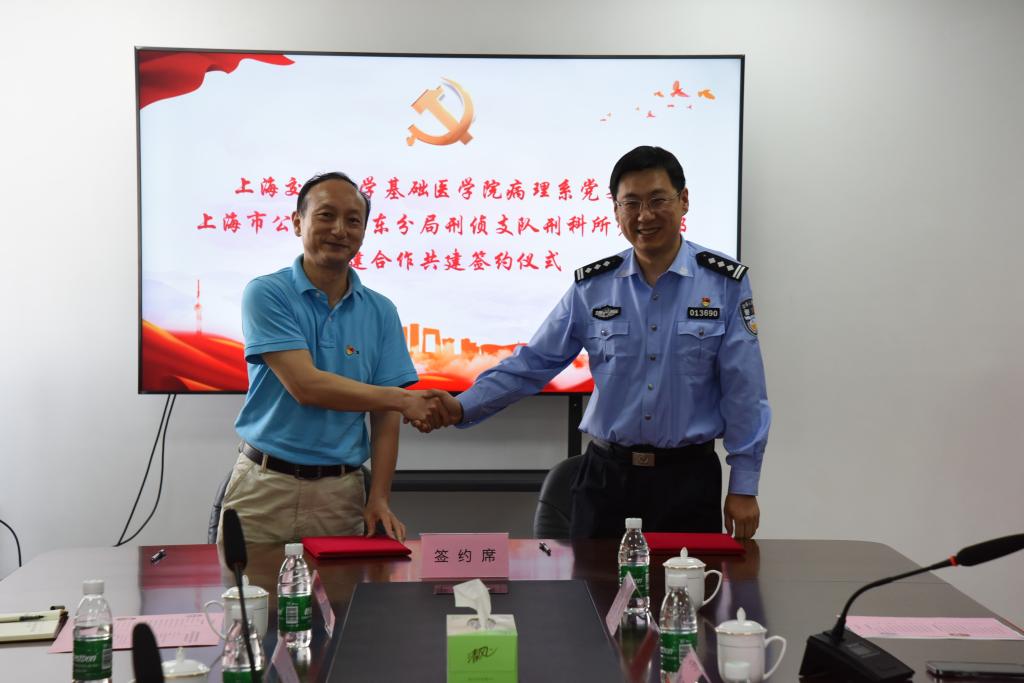 首先由浦东分局刑侦支队刑科所党支部书记田露和病理学系党支部书记蔡军分别介绍各自部门情况及党建合作共建相关情况,并举行签约仪式。