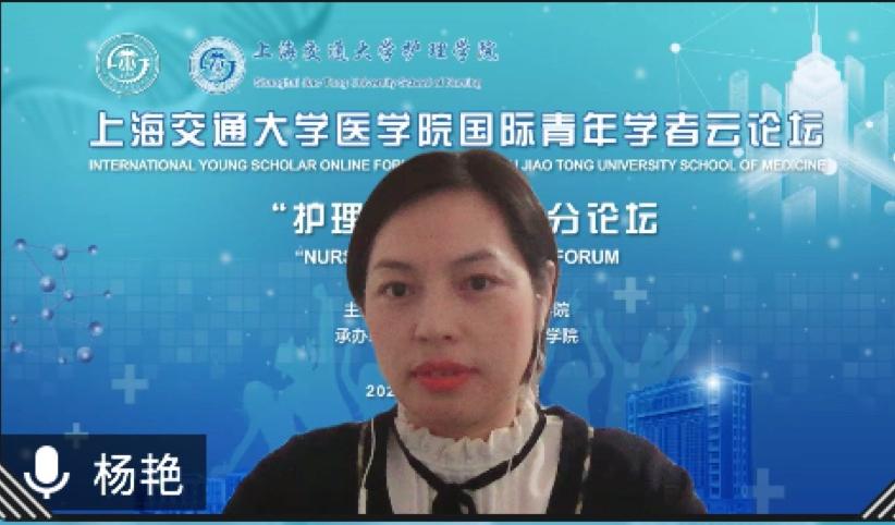 杨艳院长为分论坛开幕式致辞。她提到:在10月27日,护理学院举办了第二次“护理+X”之护理创新“大家谈”沙龙活动,会议特邀来自人工智能、材料学等方面的专家进行交流和分享。各位专家通过通熟易懂的解释结合生动的视频演示,让在座的观众大开眼界。因此,在今晚的国际青年学术论坛上,也非常期待世界各地的学者们在云中的学术交流能碰撞出绚烂的火花,为护理领域注入新思想、开拓新边疆、汇聚新能量。也希望通过这样的活动营造“护理+X”学术、科技创新的生态与氛围,探究交医护理与其他学科集智攻关、协作共赢的新局面。最后,杨院长更是诚邀各位青年学者的加盟与到来,携手共创中国特色世界一流大学护理学科!