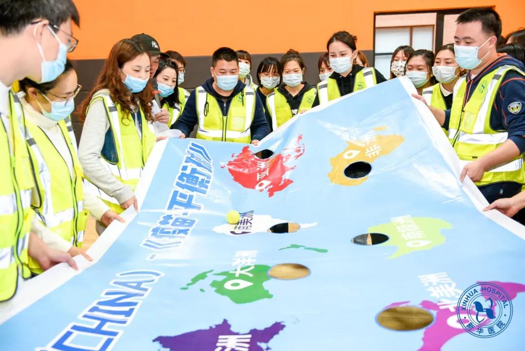 实战演练结束后,队员们撑开画有七大洲和世界卫生组织的画幅,通过团队协作,运送代表中国研制的新冠疫苗小球从中国出发,送往世界各洲,最终抵达世界卫生组织。此环节的意义象征着中国大爱,支援全球,帮助全人类共同抗击新冠疫情,打赢防疫阻击战。