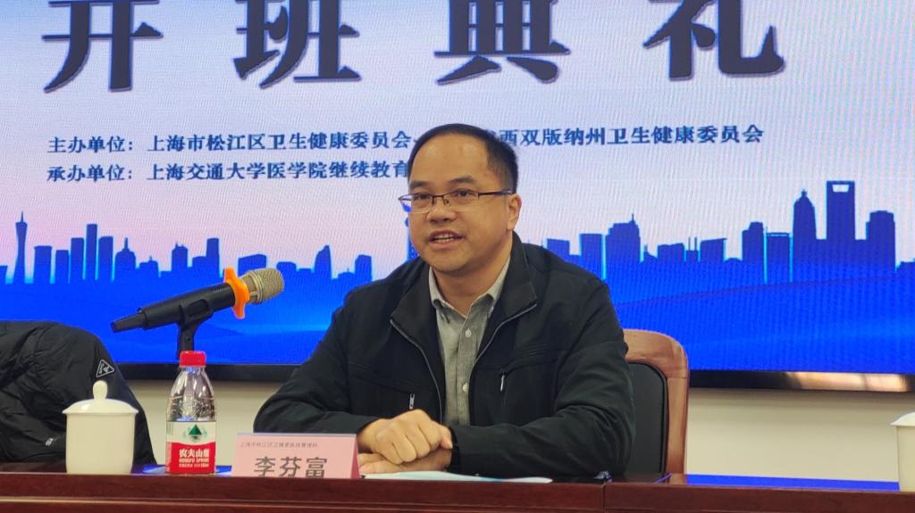 松江区卫健委医政管理科科长李芬富在开班典礼上首先致辞。他对上海交大304am永利集团官网继续教育学院对本次培训班的全力支持表示诚挚感谢,本次培训课程安排密切对接西双版纳卫生健康系统的实际需求,相信在高校优质的师资资源支持下,可以达到高水平高质量的培训效果。同时,希望本次培训能实现两地卫健委共建的预期目标,圆满完成各项培训任务。