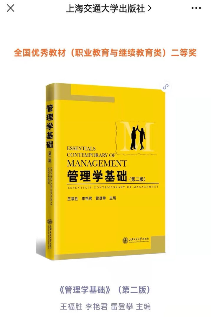 在2021年首届全国教材建设奖评选中,王福胜等主编的《管理学基础》(第二版)荣获全国优秀教材(职业教育与继续教育类)二等奖,该教材还荣获了上海市首批职业教育与继续教育精品教材。