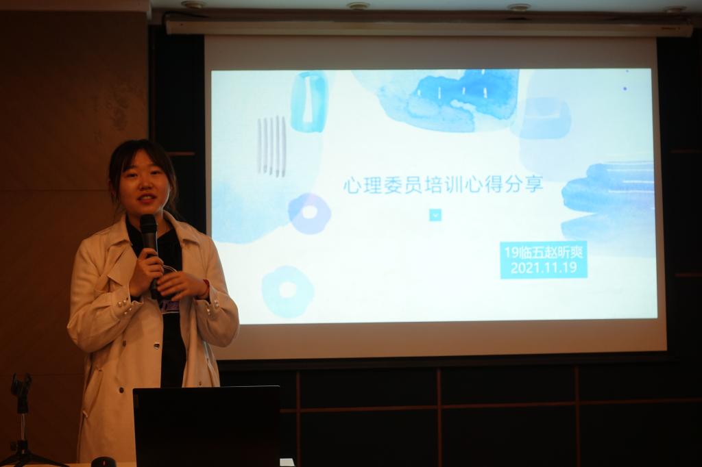 活动从心理委员分享交流环节开始,由本科生心理委员代表、曾参加上海市高校心理委员训练营的赵昕爽同学分享自己的学习体会和工作经验。她首先从心理委员的定位出发,明确了心理委员是“自身心理健康的示范者、心理健康知识的传播者、学生心理危机的发现者及同学心理健康维护的支持者”这四重身份的有机统一,接下来分别从问题发现、交流技巧及活动举办与策划这三个方面向大家讲解心理委员如何开展工作,最后设置现场问答环节与同学们就实际遇到的工作问题展开交流。在一个小时的分享中,大家既学到了“重述”、“释义”、“反射”等专业心理学概念,也了解了诸如“三托三变”等工作中的实用技巧,收获良多。