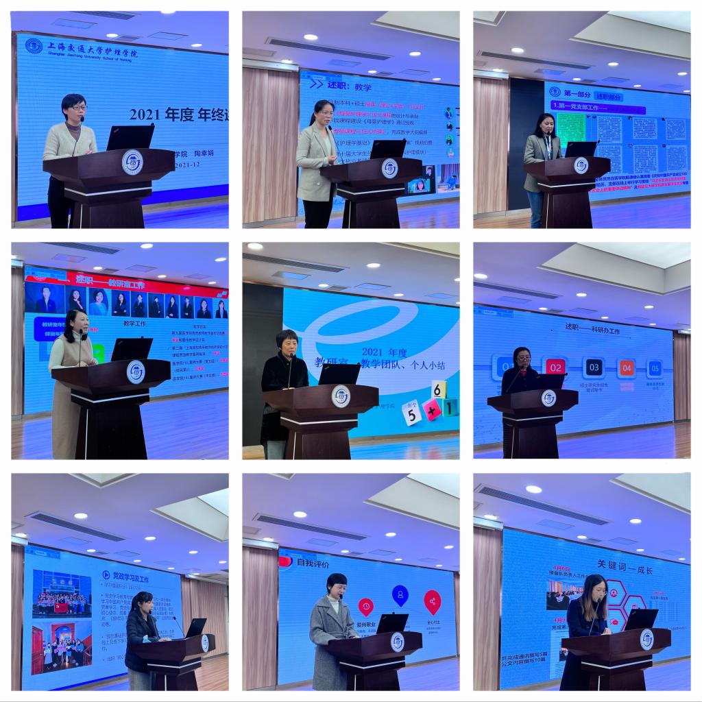述职大会是学院对各党支部、教研室、教学办公室、综合办公室、科研与学科发展办公室总体考核的项目之一。办公室主任、行政管理及教学管理人员、教研室主任、党支部书记依次上台述职,对一年来的辛勤工作进行了总结和展示,实事求是地分析了存在的问题,并提出了2022年工作思路。