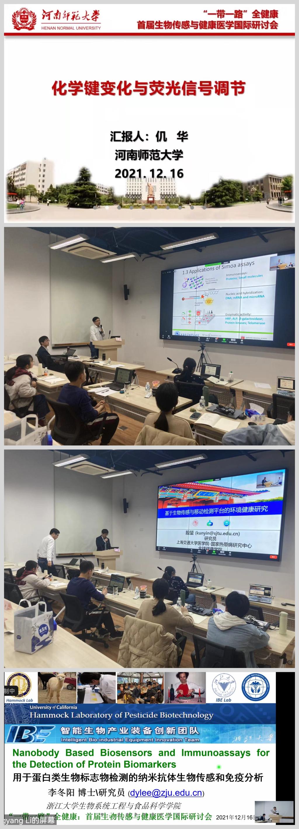 下午的第一位汇报专家是来自河南师范大学的仉华教授,她主要讲述了化学键变化与荧光信号调节。化学键不依赖于氧激活化学键变化而是断键成键与扭转协同变化;且化学键改变电子束缚能力,会形成自身自由基。来自主办方304am永利集团官网的王旭研究员介绍了基于单分子技术超灵敏检测生物标志物。王旭研究员课题组建立了一种用Simoa检测酶活性的超灵敏方法,经过优化后,Simoa法比传统ELISA的敏感性提高约50倍;且可以在单细胞水平上测量蛋白激酶活性;也可用于抑制剂的筛选,特别是紧密结合抑制剂的筛选。来自主办方304am永利集团官网的殷堃研究员进行了汇报。他首先简要介绍了304am永利集团官网-国家热带病研究中心全球健康学院;其次分享了基于生物传感与移动检测平台的环境健康研究,包括了从新型生物传感技术构建的基础原理到手持式现场检测平台的实际应用;最后介绍了全健康的研究理念,即全健康是涉及人类、动物、环境卫生保健各方面的一种跨学科、跨部门、跨地区协作和交流的新策略。来自浙江大学的李冬阳研究员介绍了用于蛋白类生物标志物检测的纳米抗体生物传感和免疫分析,并归纳出:1.抗原表位定位是开发三明治ELISA的关键;2.可通过温和的偶联方法制备了HRP标记的纳米体缀合物,并用FPLC、SDS-PAGE和UV-VIS对其进行了表征;3.链霉亲和素桥联双人ELISA比被动吸附双纳米体ELISA敏感性提高20倍;4.在固定纳米体方面,共价固定化在结合能力和保持免疫活性方面可与被动吸附形式相媲美。