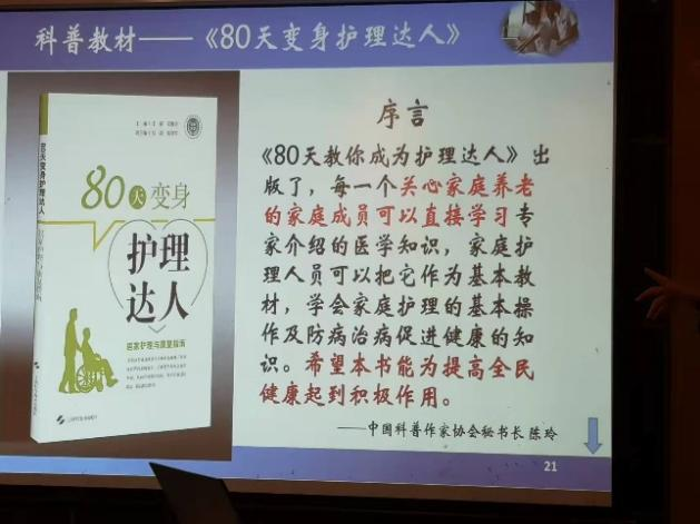 为让更多的护理人员积极参与到健康科普队伍中,创新健康科普推广形式,更好、更从容地把科普知识传递给需要的人群,章雅青所长以“80天变身护理达人”为例,分享了《写好医学科普文章,提升健康素养》的主题报告。分享中章所长从我国居民健康素养现状入手,对医学科普与健康教育的时代意义、医学科普的权威性和公益性要求、内容质量控制及专业医学科普内容制作特色等进行了深入地分享。以医护专家携手创作的“80天变身护理达人”科普著作,突出了“家庭照顾者”理念,将科学专业的知识用通俗易读的语言提供给照护者。目前该科普书籍已经在部分医院、社区进行推广。同时,指出护理人员具有进行医学科普的“天然”优势,希望与会的护理管理者能鼓励更多临床护理人员加入到医学科普队伍,用权威医疗知识服务于具象、精准的个体化需求,让老百姓获益。