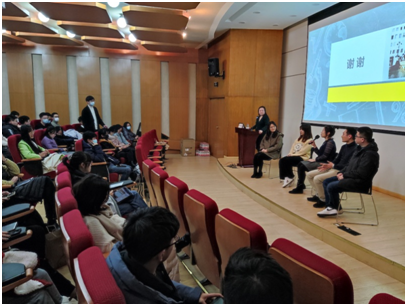 随后,其他4位刚刚在2021年10月结束法国住院医师培训回国的法文班同学黄静怡、王晶莹、顾明均、林正钰一起上台,开始了一场“法式座谈会”。他们在国内外新冠疫情的复杂形势下,坚持理想与初心,毅然赴法。这段特殊时期在法国做医生的经历,让他们收获了最特殊、最与众不同的感悟。学弟学妹们踊跃提问,学长学姐们有感而发积极分享,交流会在热烈的交流与互动中圆满结束。