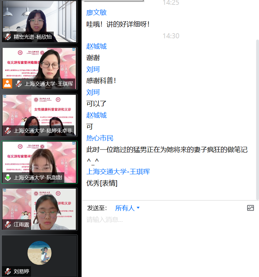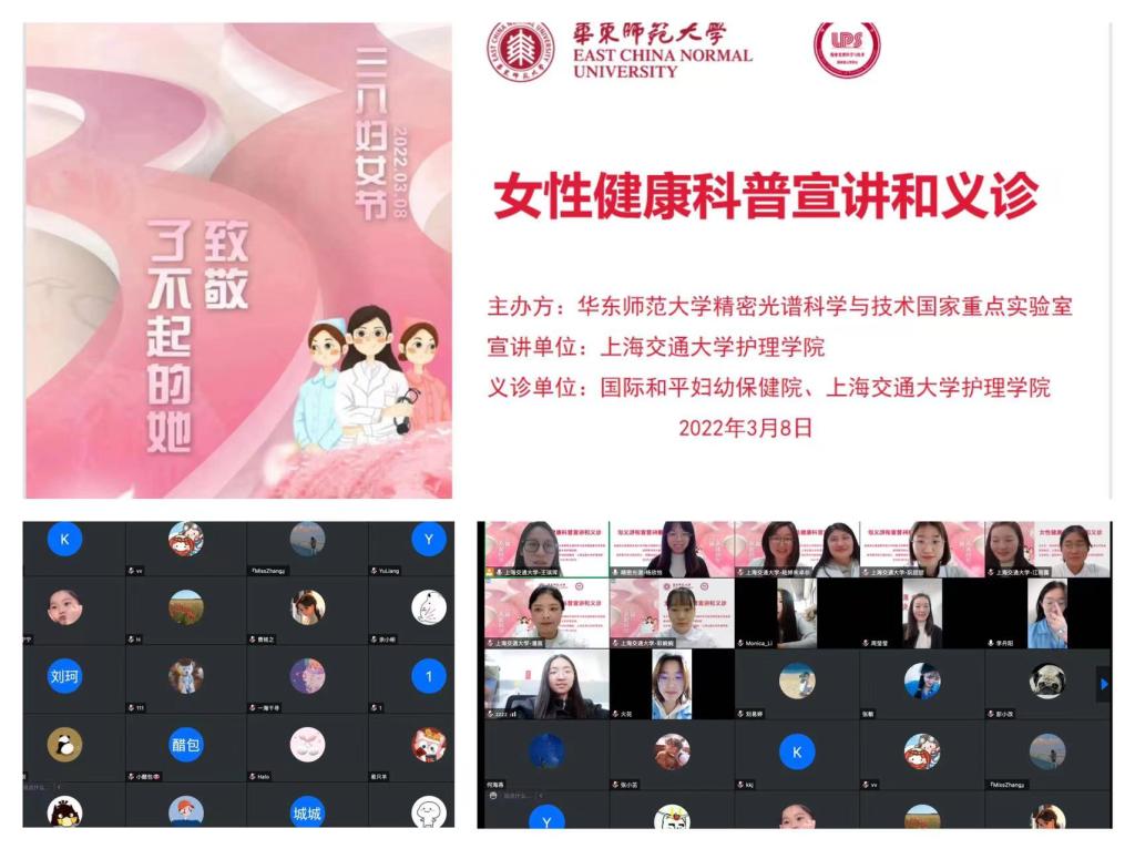 3月8日,护理学院与华东师范大学精密光谱科学与技术国家重点实验室团委、国际妇幼和平保健院联合举办了“情暖三月——女性常见疾病科普宣讲和义诊”服务活动。护理学院朱卓非老师、周莹莹老师和附属国际和平妇幼保健院的陆婷老师带领学生科普宣讲团队进行女性常见疾病的介绍和义诊。活动由华东师范大学精密光谱科学与技术国家重点实验室团委实验室团委书记杨欣怡老师主持,护理学院王琪珲同学联席主持,近50余名华东师范大学的同学在线上收听了讲座。