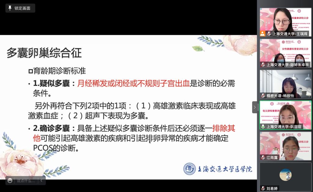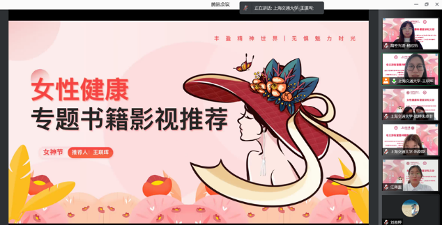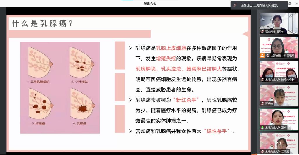 讲座中,护理学院的彩婉婉、潘宸、江雨露、阮甜甜同学通过基础知识讲解、图片展示等方式,结合前期征求的同学们意愿,系统地讲解了乳腺癌、多囊卵巢综合征、宫颈癌等女性常见疾病的病因、表征、危害以及预防,深入浅出地为大家讲授了一堂女性健康知识课程,并呼吁广大女性要时刻关注自身健康,珍爱生命,做好预防,降低患病风险。王琪珲同学向大家推荐了一些能帮助女性认识自我、形成良好生活习惯的书籍,鼓励大家做新时代美丽健康新女性。讲座内容丰富、讲解生动,具有较强的针对性和实用性,得到了华东师范大学师生们的一致认可。