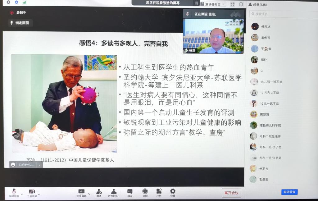 活动紧密结合疫情防控时期全院师生的思想动态,积极开展医学人文关怀专题介绍,帮助学院师生增强抗疫信心、稳定焦虑情绪。张浩院长分享了《如何做一名优秀的儿科医生》,他回顾了成长经历及职业生涯,鼓励同学们“勇于走出舒适区”,“多读书多观人、积极完善自我”,努力和时代共前行。心内科刘廷亮副主任分享了《疫情下的医学人文关怀》。他提到,疫情变化及区域闭环管理对普通居民、病人、家属、医护的心理活动及情绪调节带来了巨大考验,及时有效的医学人文关怀对疫情防控工作起着重要作用。感染科沈楠博士为同学们分享了她在科研方面的思考——《医学创新我们可以做什么》。她说,医学创新需要仰望星空,脚踏实地的态度,希望同学们能开动思维,勇敢创新,努力成为具有国际视野的卓越医学创新人才!