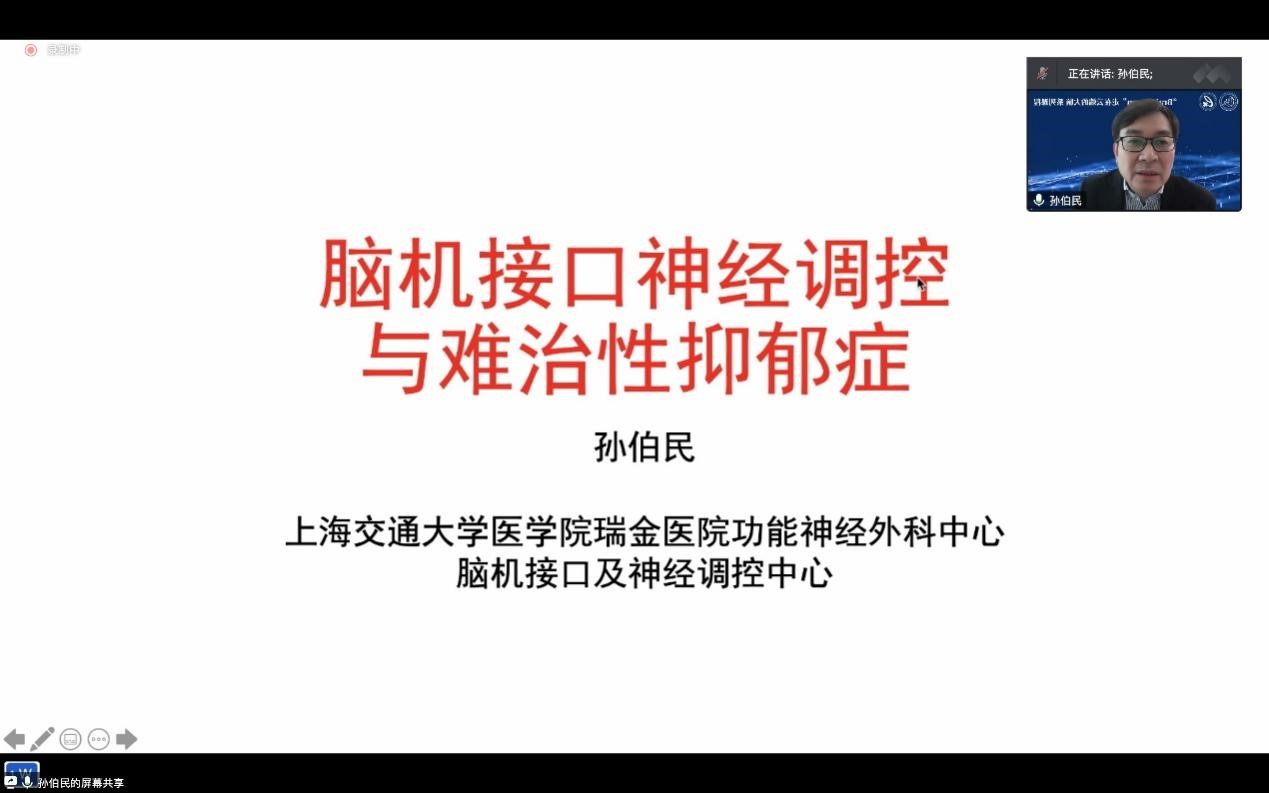 孙伯民教授带来题为《脑机接口神经调控与难治抑郁症》的讲座。孙伯民通过真实案例的分享介绍了国内外运用深部脑刺激(Deep brain stimulation,DBS)治疗抑郁症的现状、脑机接口神经调控治疗难治抑郁症的优势和劣势,介绍了团队围绕着情感障碍诊治的系列研究成果。他指出,DBS用于抑郁症这类疾病治疗的进一步研究方向包括寻找特异性的bio-marker、脑机接口的程序性控制及闭环自反馈系统,进一步完善这一技术的临床意义。在问答环节,孙伯民进一步解答了关于DBS是否会对被植入者造成脑损伤、深部电刺激对抑郁症躯体症状的疗效、除抑郁症外DBS在临床上的应用等问题,同学们表示受益匪浅。