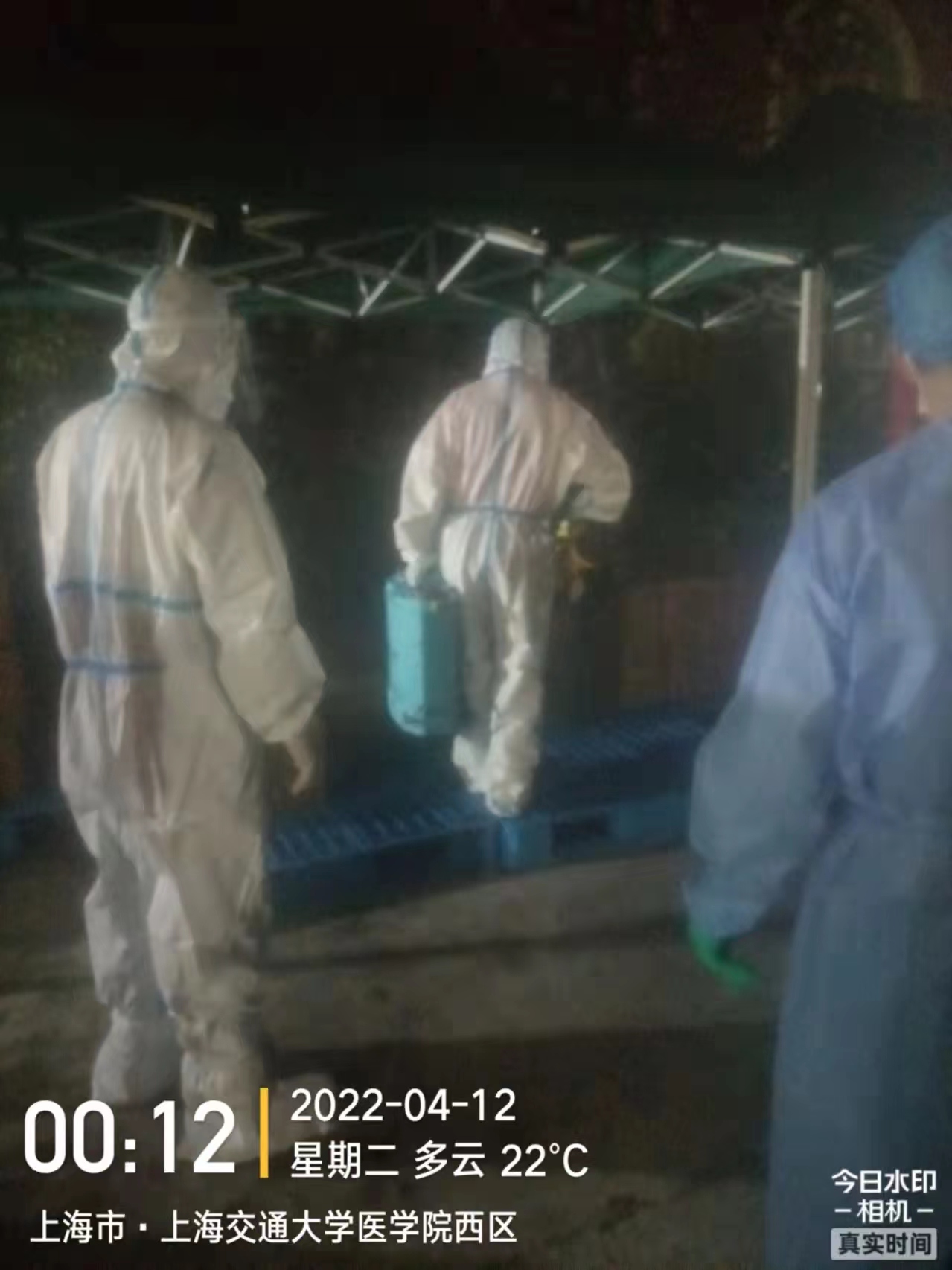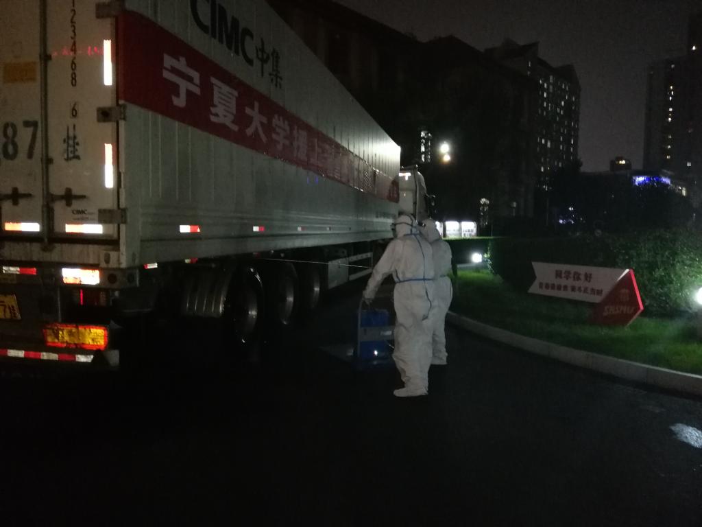 消杀专班队员工作非常认真仔细,他们不辞辛苦,经常凌晨就开始消杀,直到深夜,做到了随到随消杀,有力的保障了物品进校的快速和安全。自开展工作以来,消杀专班队员毫无怨言,任劳任怨,在队长武保处潘帮云队长的带领下共消杀进校物品1000余批次,总计近万箱各类货物,约100多吨的抗疫物资、蔬菜、食物及生活用品等。