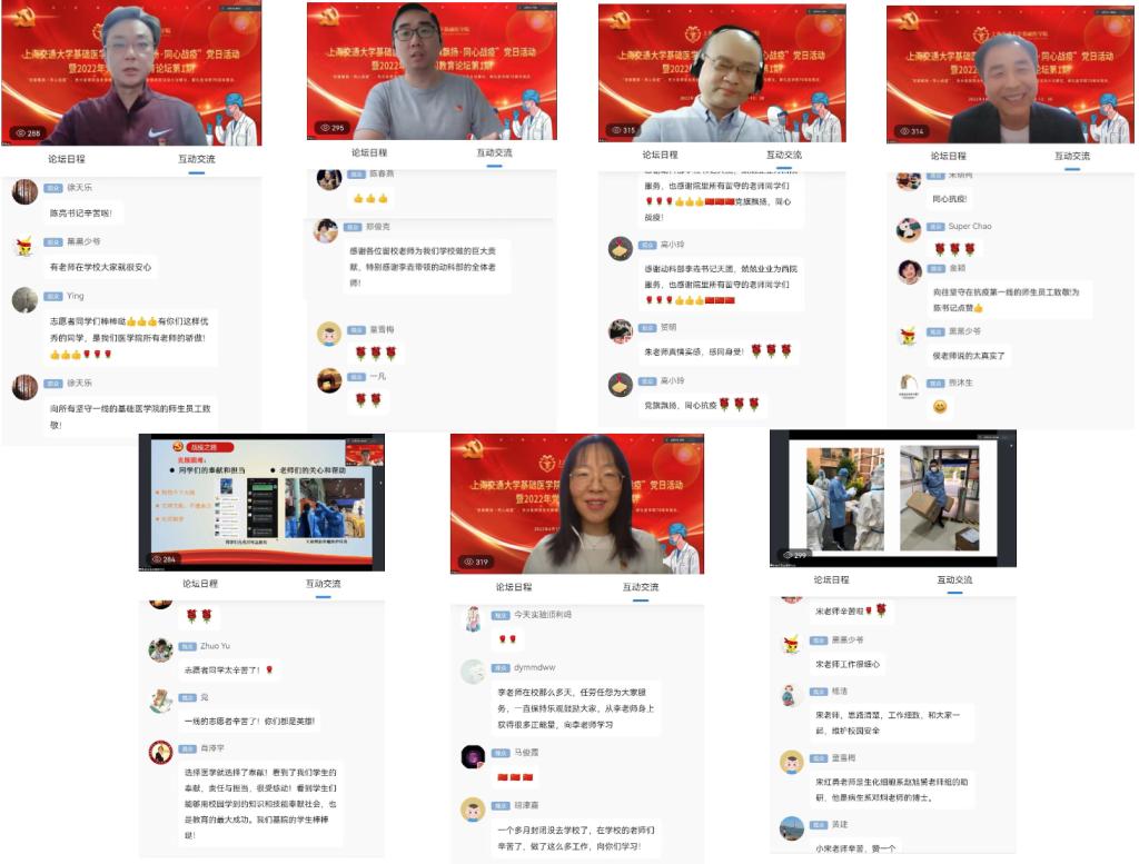 本次党日活动邀请了实验动物科学部支部书记、主任李垚,病理生理学系党支部副书记、副主任张亮,基础304am永利集团官网党委委员、药理学与化学生物学系副主任朱亮,生物化学与分子细胞生物学系课题组长侯照远,生物化学与分子细胞生物学系教师宋红勇以及研究生第五党支部书记吴文伟等6名师生代表作为论坛主讲嘉宾,分别从各自所在部门及自身出发分享了校园封闭期间“战疫”工作。