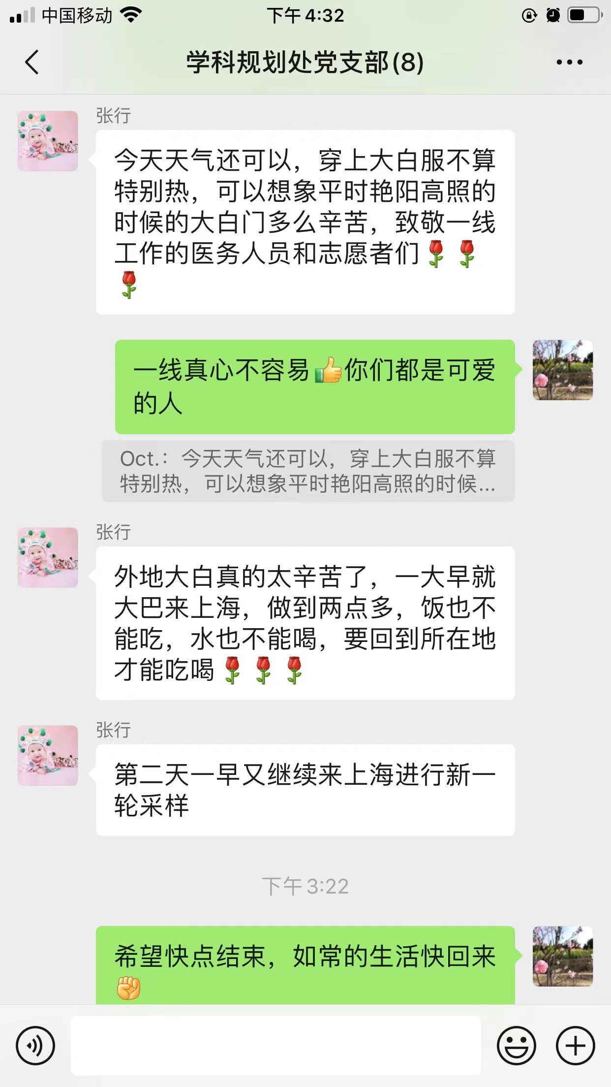3月底,支部全体党员积极响应上级党组织号召,通过“先锋上海”向所在社区党组织报道,参与社区抗击疫情志愿服务。4月15日,接上级党组织通知,支部党员群众除特殊情况外,均报名市级单位统筹抽调工作。支部党员李冬凉、王甦平第一时间向身边困难群众伸出援手,捐献物资、组织采购;李春红、施琼芸、张薇薇和张行等在所居住小区进行了信息统计、病毒消杀、抗原发放、协助核酸检测、物资采购及搬运等工作。陶晔璇同志接到通知,已正式向一线部门报道,参加志愿服务活动。